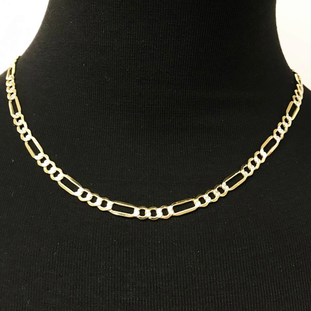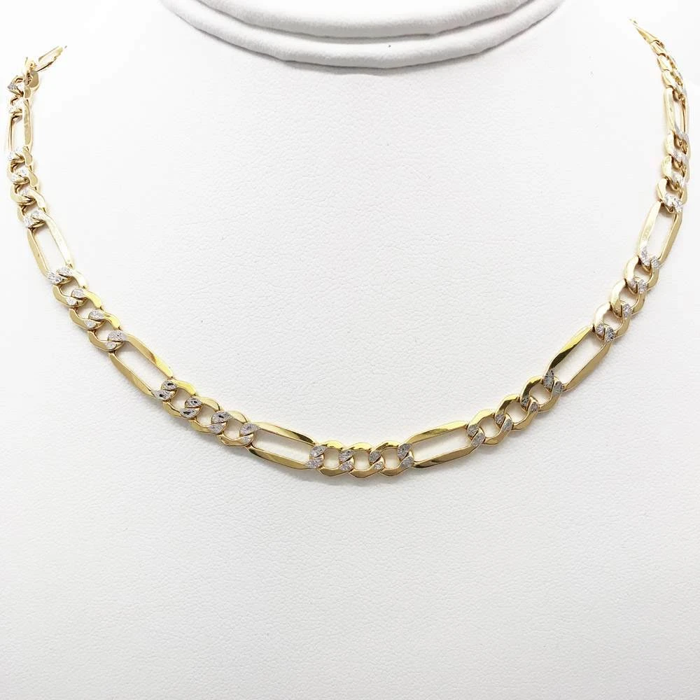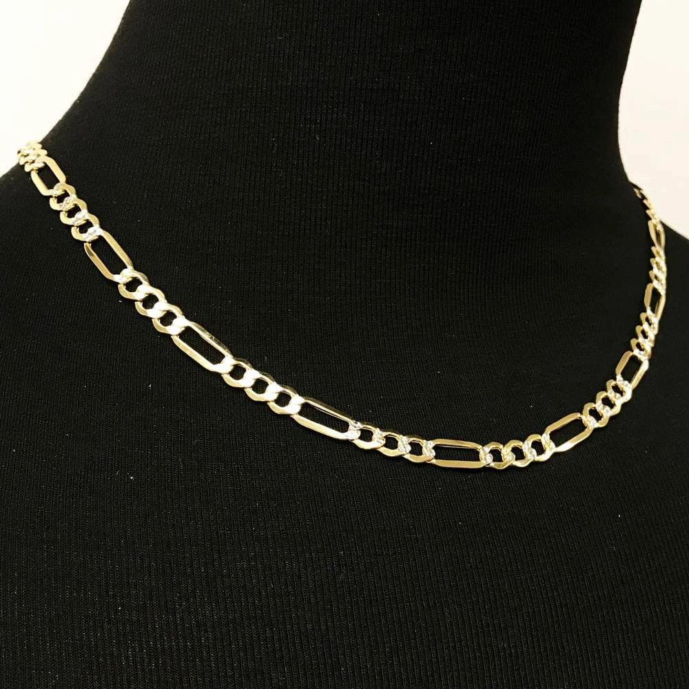 10K Yellow Gold Figaro Chain. This Figaro Necklace is crafted from Solid 10K Yellow Gold and Diamond Cut to add sparkle to your necklace. Lightweight made to get you a bigger look for a great value.