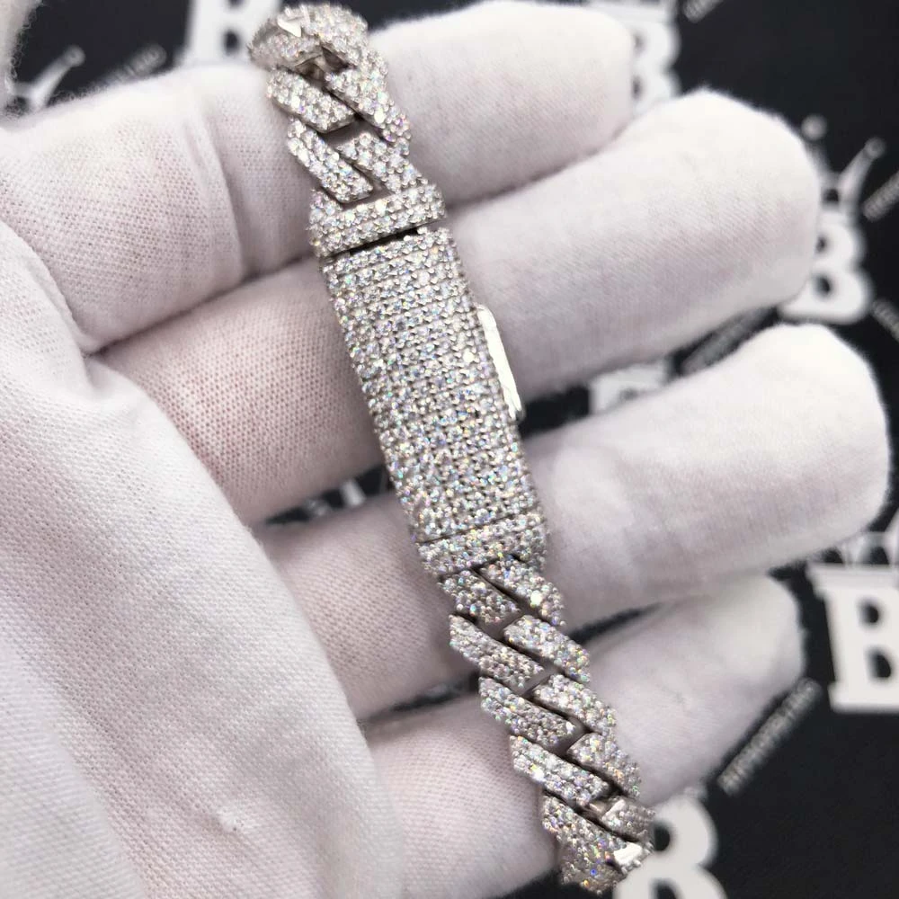 10MM Moissanite Iced Out Cuban Chain Sharp Link .925 Sterling Silver. This iced out Cuban Chain is simply breathtaking and displays an incredible bling bling shine. We insisted on using the finest Moissanite stones available to craft these perfect high end ‘diamond’ Iced Out Cuban Link Necklaces. Moissanite stones are carbon based stones just like real Diamonds*. The benefit of our Moissanite Cuban Link Chains are that you get a better shine for much less money. Our Moissanite Stones have a higher refractive index than real Diamonds and rank 9.5 on Mohs hardness scale. Â