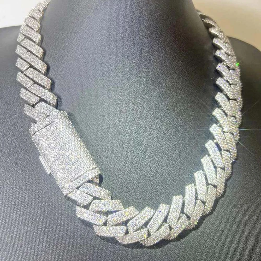 20MM XL VVS Moissanite Iced Cuban Chain Sharp Link .925 Sterling Silver. This iced out Cuban Chain is simply breathtaking and displays an incredible bling bling shine. We insisted on using the finest Moissanite stones available to craft these perfect high end ‘diamond’ Iced Out Cuban Link Necklaces. Moissanite stones are carbon based stones just like real Diamonds*. The benefit of our Moissanite Cuban Link Chains are that you get a better shine for much less money. Our Moissanite Stones have a higher refractive index than real Diamonds and rank 9.5 on Mohs hardness scale.