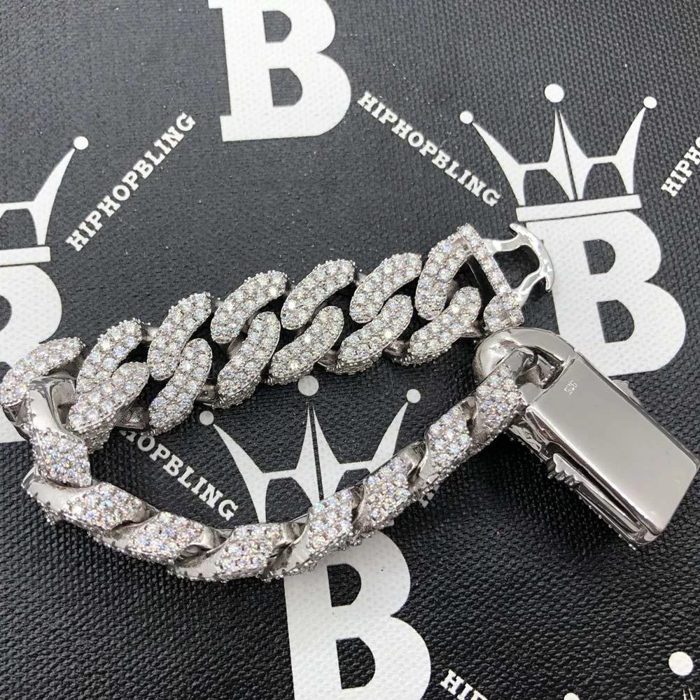 3D Cuban Moissanite Bracelet Iced Out 18MM .925 Sterling Silver. This iced out Bracelet is simply breathtaking and displays an incredible bling bling shine. We insisted on using the finest Moissanite stones available to craft these perfect high end ‘diamond’ Iced Out Cuban Link bracelets. Moissanite stones are carbon based stones just like real Diamonds*. The benefit of our Moissanite Cuban Link bracelets are that you get a better shine for much less money. Our Moissanite Stones have a higher refractive index than real Diamonds and rank 9.5 on Mohs hardness scale. Â