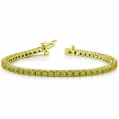 Classic 4MM Diameter CZ Simulated Diamond Tennis Bracelet. Canary Yellow Simulated Diamond CZ stones hand set with precision. Prong set with great skill, not glued in stones. Very shiny and real looking. 5x gold dipped to make this bracelet look and feel real and stay shining. Hand Crafted to look, feel, and Shine Like Genuine Diamond Hip Hop Jewelry. Shine with the best hip hop jewels in the game.