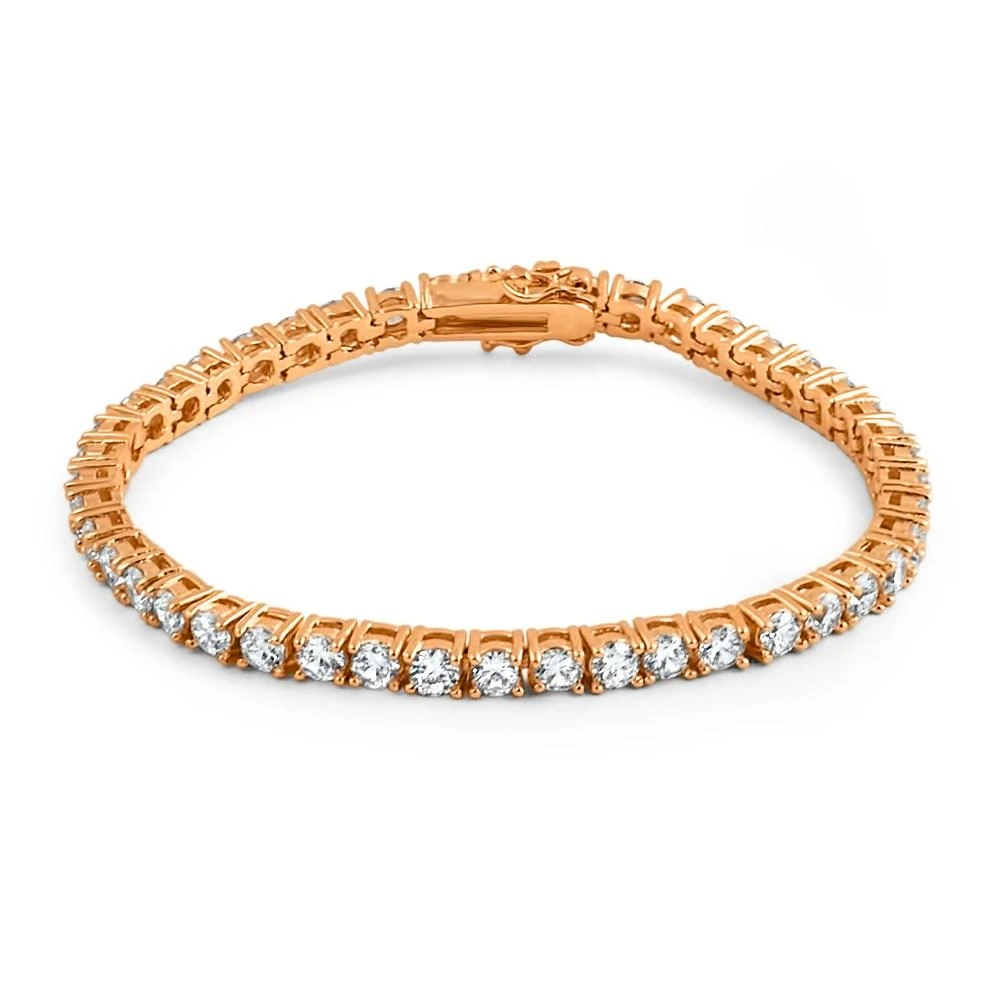 Rose Gold Classic 4MM Diameter CZ Simulated Diamond Tennis Bracelet. Simulated Diamond CZ stones hand set with precision. Prong set with great skill, not glued in stones. Very shiny and real looking. 5x dipped to make this bracelet look and feel real and stay shining. Hand Crafted to look, feel, and Shine Like Genuine Diamond Hip Hop Jewelry. Shine with the best hip hop jewels in the game.
