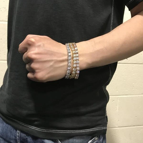 Yellow Gold Classic 6MM Diameter CZ Simulated Diamond Tennis Bracelet. Simulated Diamond CZ stones hand set in the middle with smaller stones on the sides. Prong set with great skill, not glued in stones. Very shiny and real looking. 5x dipped to make this bracelet look and feel real and stay shining. Hand Crafted to look, feel, and Shine Like Genuine Diamond Hip Hop Jewelry. Shine with the best hip hop jewels in the game.