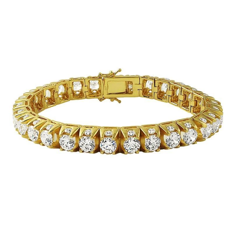 .925 Sterling Silver 3D Tennis Bracelet. 14K Gold Dipped 10x for maximum realistic and long lasting gold shine. All simulated diamond CZ stones are prong set by hand just like how real diamonds are set. Amazing look and feel for this quality bling bling bracelet. Order yours now!