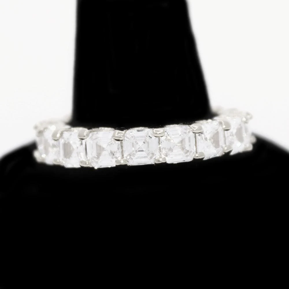 .925 Silver Asscher Cut Eternity Band CZ Hip Hop Bling Ring. Crafted from Fine .925 Sterling Silver and Dipped in White Gold or Yellow Gold. Heavy weight with Solid Back. The VVS CZ Simulated Diamonds have a bling bling shine as if they were genuine diamonds.