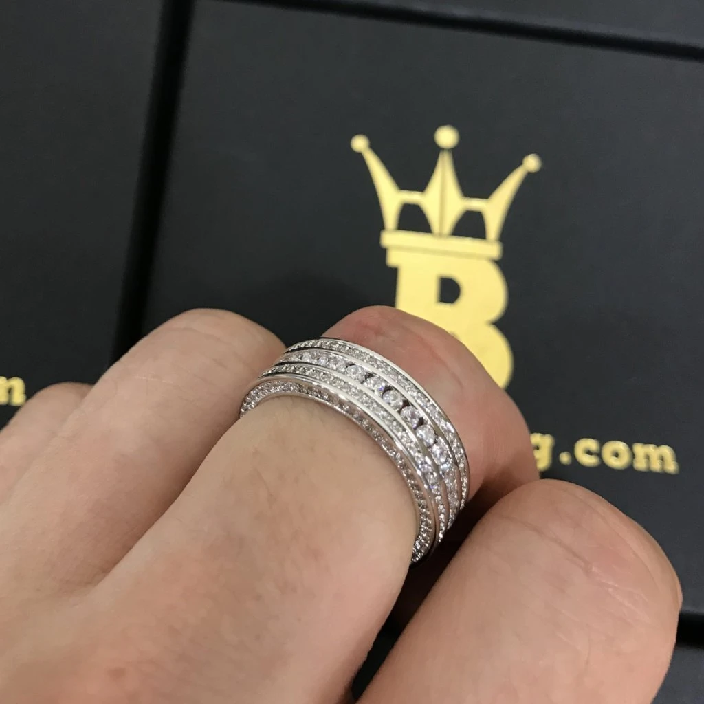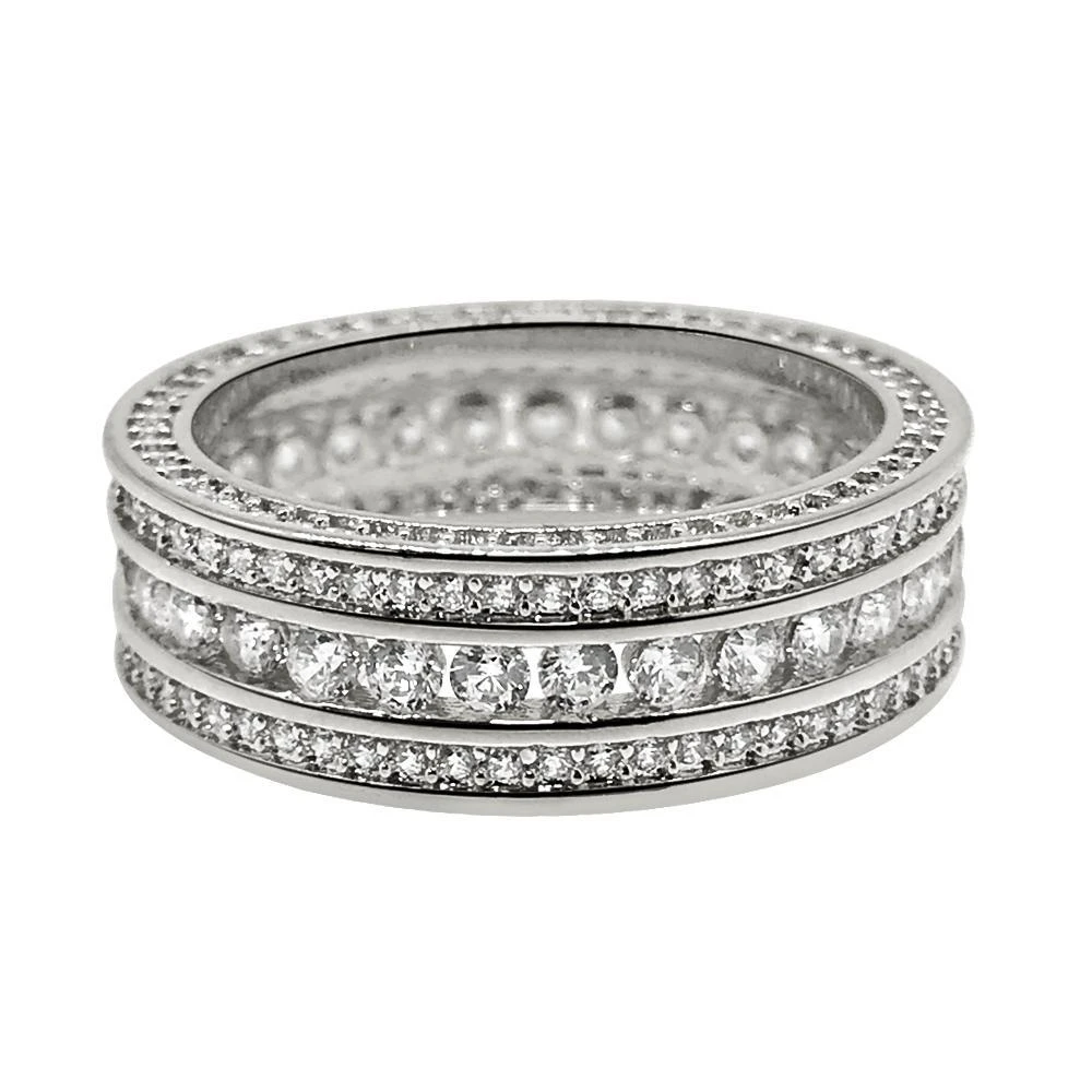 .925 Sterling Silver Channel Set Eternity BandBling Bling Ring. Shine up your fingers with this shiny Eternity Hip Hop Ring. Channel Set Simulated Diamonds in the center surrounded by 2 rows of Micro Pave Set Stones PLUS Both Sides of the bling bling ring are covered in Stones. Crafted from Fine .925 Sterling Silver and RhodiumWrapped to look and feel like solid White Gold or Platinum for a fraction of the cost and keep on shining. Order your bling bling ring today andStyle like a rap star!