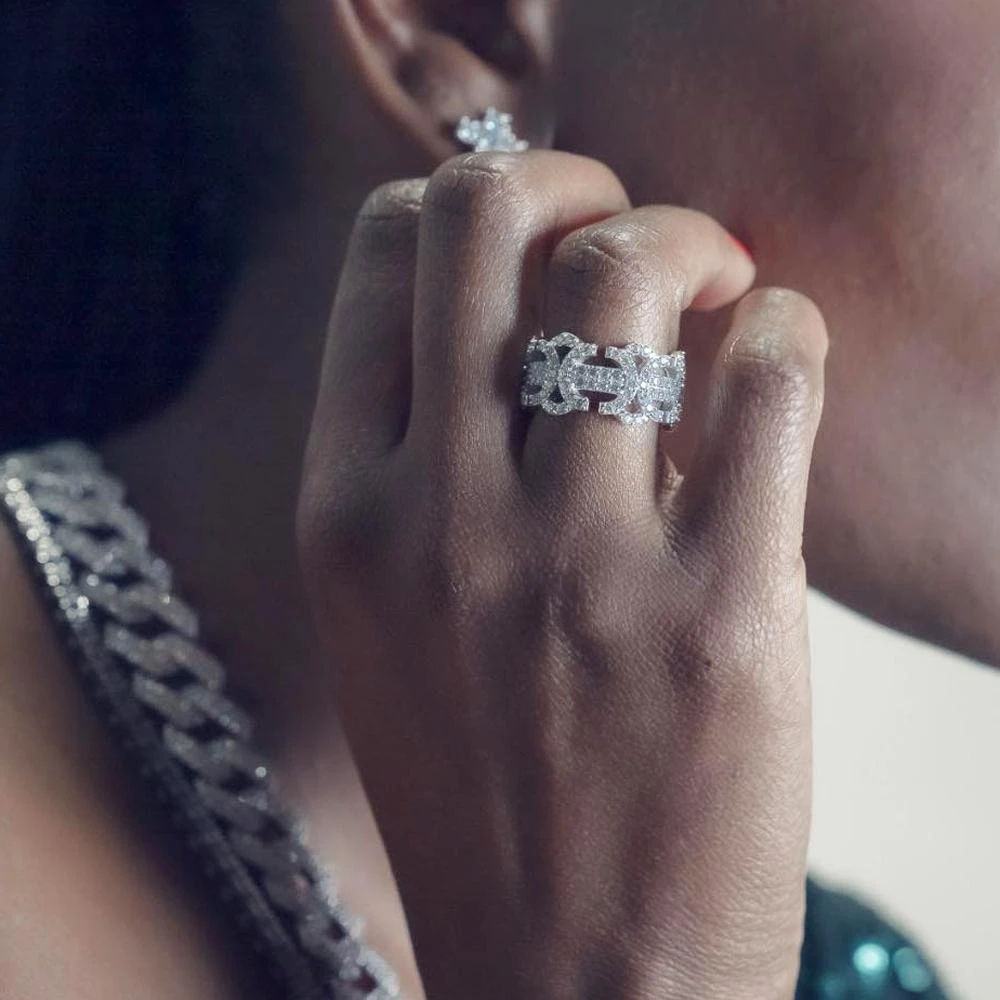 .925 Sterling Silver Byzantine CZ Hip Hop Bling Ring. Crafted from Fine .925 Sterling Silver and Dipped in White Gold or Yellow Gold. Heavy weight with Solid Back. The VVS CZ Simulated Diamonds have a bling bling shine as if they were genuine diamonds. HipHopBling Quality Crafted to look and feel like Genuine Diamond Hip Hop Jewelry. Diamond Versions also available for order.
