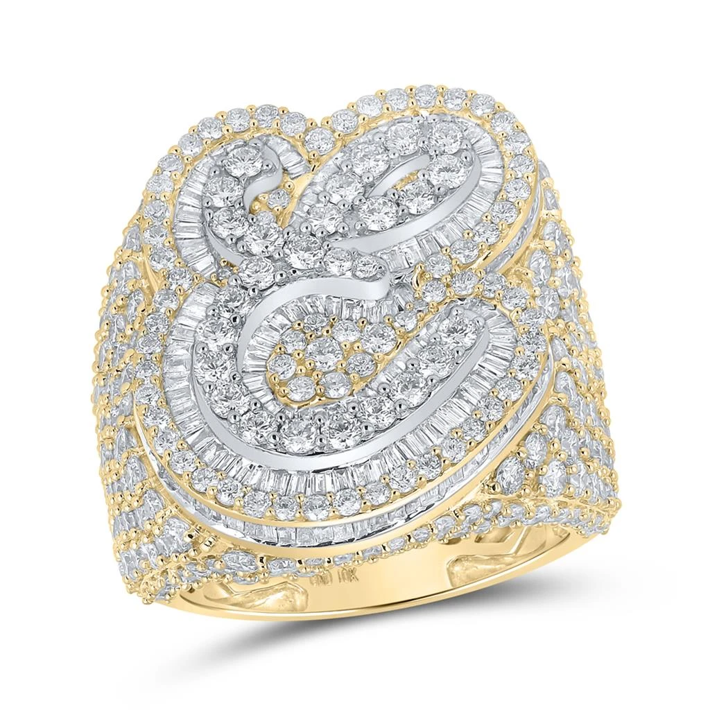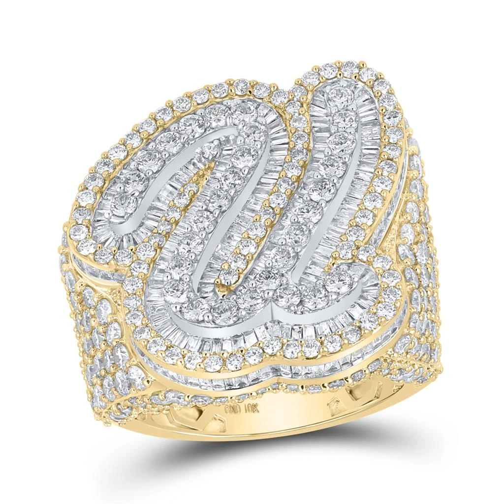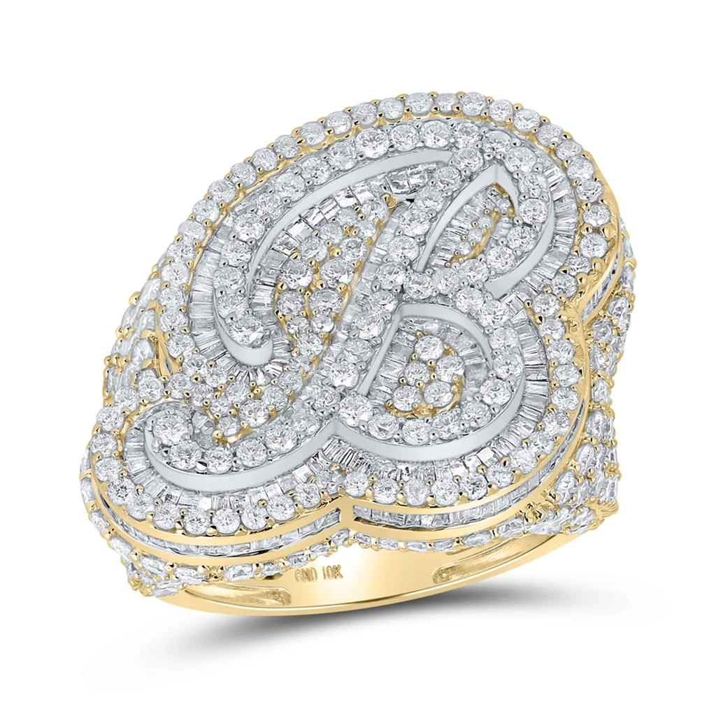 A-Z Initial Cursive Diamond Baguette Diamond Ring 10K Yellow Gold. Uniquely crafted Diamond ring iced out with a bling bling shine.  Custom Designer looking Mens Bling Bling Ring. Precision detailed prong Diamond Setting on this Diamond iced out ring. Beautiful big and bold look. Popular style Hip Hop Bling Bling Ring is crafted with 10K Yellow Gold and Genuine Natural Diamonds.