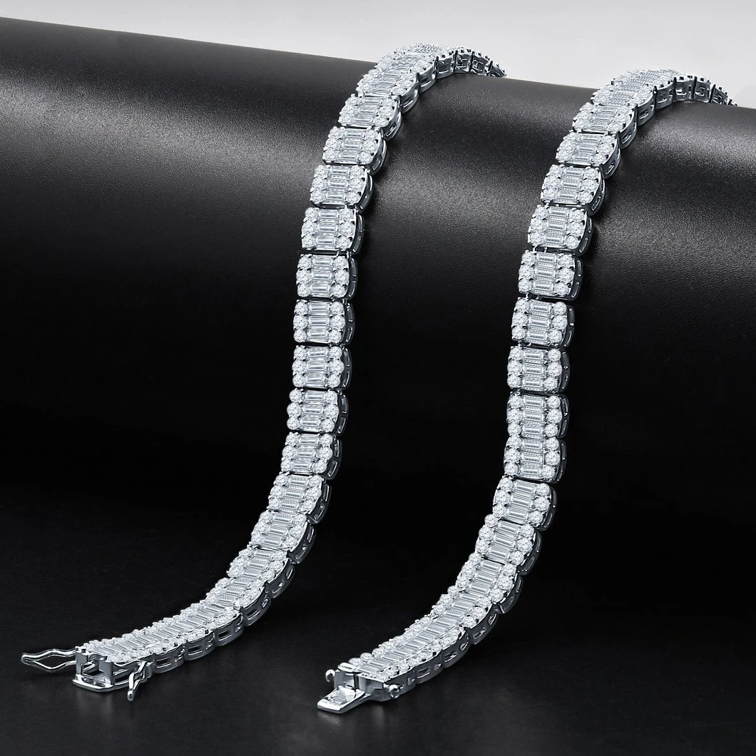 Baguette Center Link CZ Iced out Chain .925 Sterling Silver. This iced out chain is crafted with fine .925 Sterling Silver. Each stone is a VVS CZ Simulated Diamond prong set that shines and blings like real diamonds. Get your quality bling bling chain today.