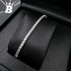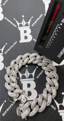 Baguette Cluster Moissanite Bracelet Iced Out .925 Sterling Silver. This iced out Bracelet is simply breathtaking and displays an incredible bling bling shine. We insisted on using the finest Moissanite stones available to craft these perfect high end ‘diamond’ Iced Out Cuban Link bracelets. Moissanite stones are carbon based stones just like real Diamonds*. The benefit of our Moissanite Cuban Link bracelets are that you get a better shine for much less money. Our Moissanite Stones have a higher refractive index than real Diamonds and rank 9.5 on Mohs hardness scale. Â