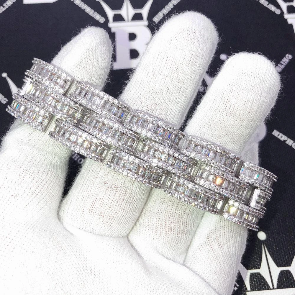 Baguette Jubilee VVS Iced Out Hip Hop Bracelet. Classic and Unique Style Bling Bling Bracelet. Hidden butterfly buckle so the ice is continuous around the iced out bracelet. High end quality setting to maximize bling bling shine and look expensive. Incredibly icy with VVS simulated diamond stones lighting up your wrist with the best shine possible. This iced out Bracelet shines like genuine diamonds. All hand setting, no glue. Hand Crafted to look, feel, and Shine Like Genuine Diamond Hip Hop Jewelry. We can custom make in 10K and 14K Solid Gold with Real Diamonds. Shine with the best hip hop jewels in the game.