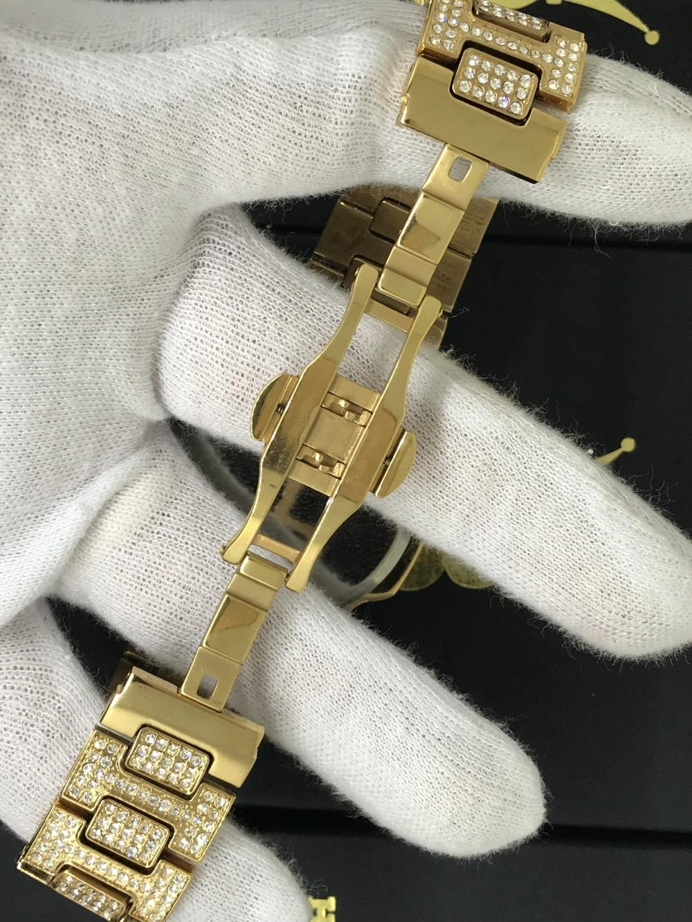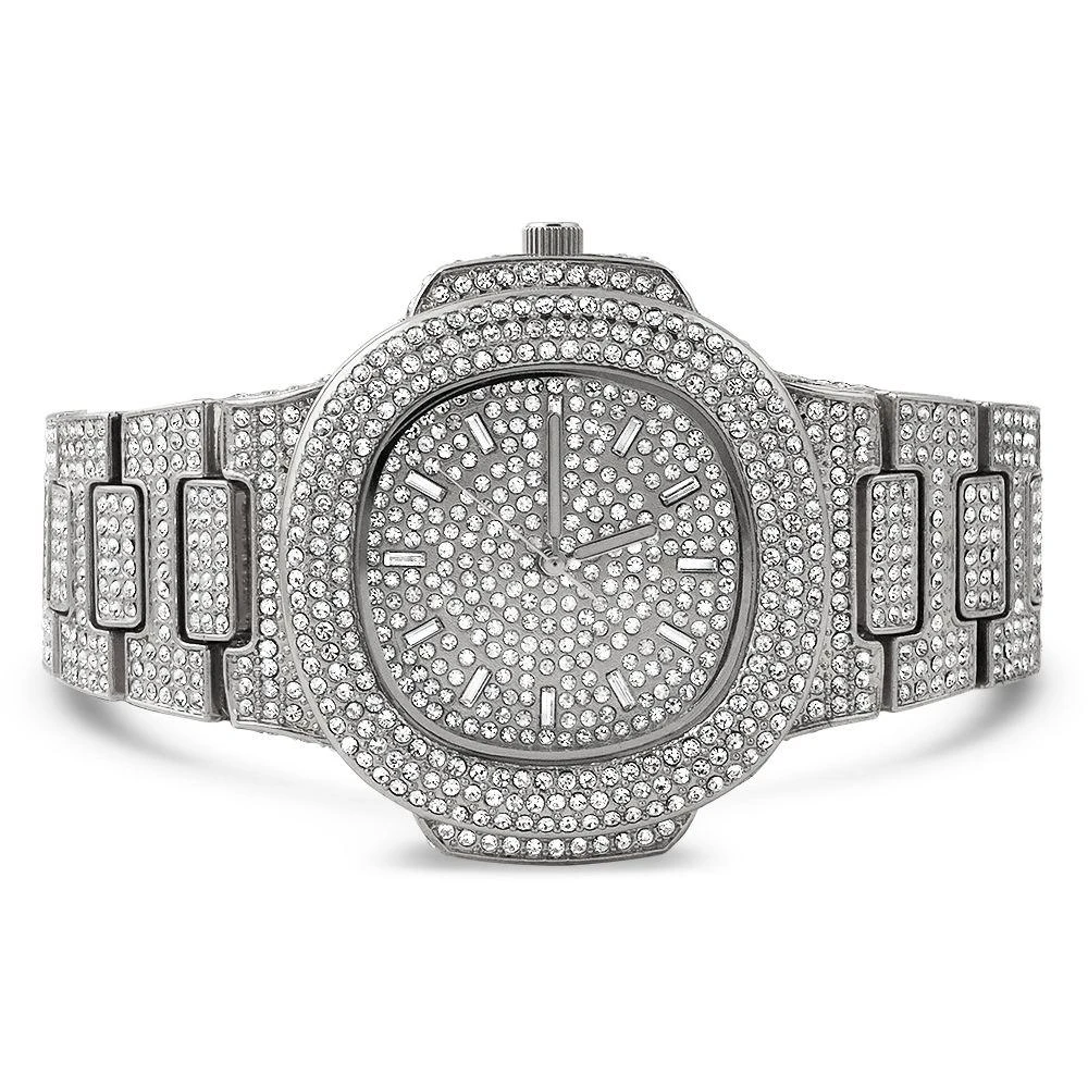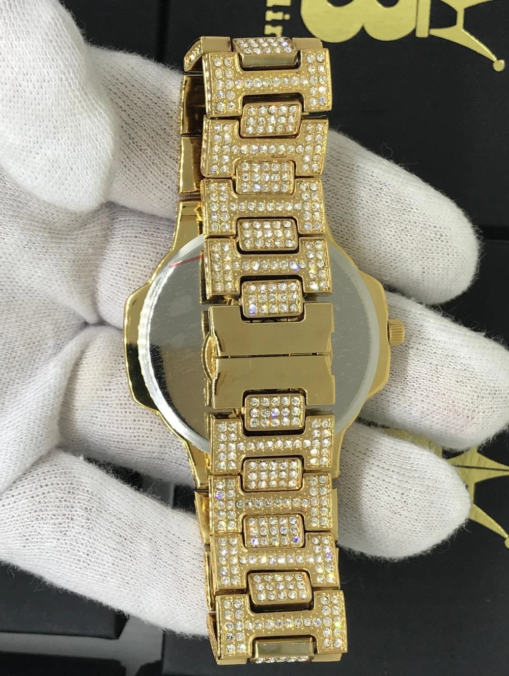 NEW Big Face 44MM Bling Bling Fully Custom Ice Blizzard Watch. Incredible bling bling shine on this gold hip hop watch. Iced out with well over 1500 Simulated diamond Czech Crystal Stones covering the dial, bezel, side of bezel, lugs, case, band, and even the side of the band!. Features a Stainless Steel Butterfly Clasp for that high end look and feel. This bling bling watch is made on a much higher quality level than the rest of the watches out there. Better, long lasting Gold color, brighter shine, and full stone coverage all the way around the band. Order your Big Face Blizzard Bling Bling Watch Today.
