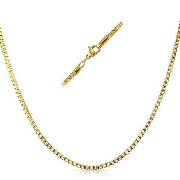 Sleek, simple and stylish mens quality gold Stainless Steel Box chain is a great addition to your jewelry collection. Quality IP Gold Stainless Steel is made to look and feel real. High polished for extra shine. This necklace measures 2mm or 4mm in width with many length options to choose from. Features soldered end caps with a lobster claw clasp. Order your gold box chain necklace today and don’t forget a matching bracelet.