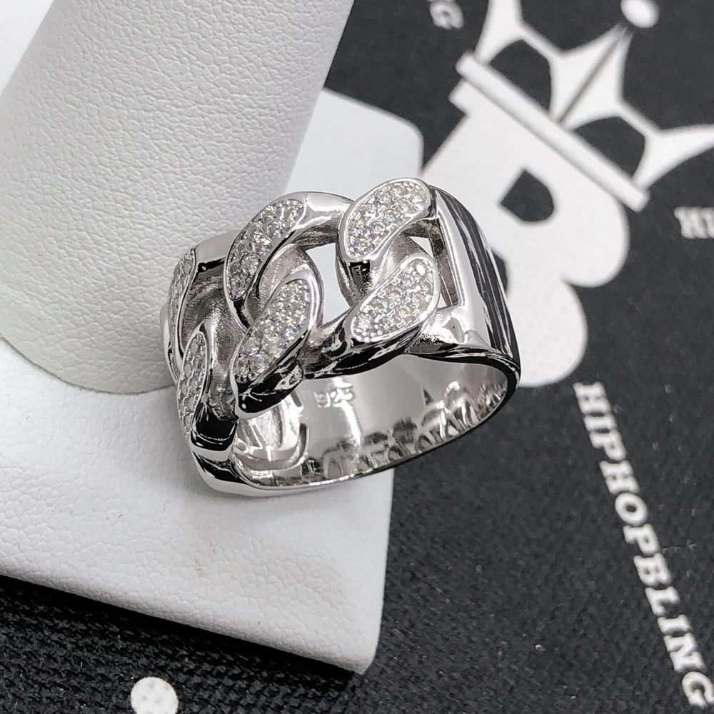 Cuban Iced VVS Moissanite Ring .925 Sterling Silver. This iced out Moissanite Cuban link ring is simply breathtaking and displays an incredible bling bling shine. We insisted on using the finest Moissanite stones available to craft this perfect high end ‘diamond’ bling bling Moissanite Micro Pave iced out ring. Moissanite stones are carbon based stones just like real Diamonds. The benefit of our Moissanite hip hop jewelry is that you get a better shine for much less money than genuine Diamonds. Our Moissanite Stones have a higher refractive index than real Diamonds and rank 9-9.5 on Mohs hardness scale.