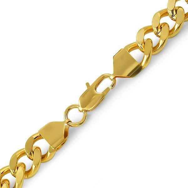 Great quality Heavy Weight IP Gold Stainless Steel Cuban bracelet that is made to look and feel real. Look like a real baller or hip hop star with this fat gold cuban bracelet. High polished for extra shine. This bracelet measures 12MM in width and features soldered end caps with a lobster claw clasp. Get your stainless steel bracelet today and don’t forget to order your matching chain.