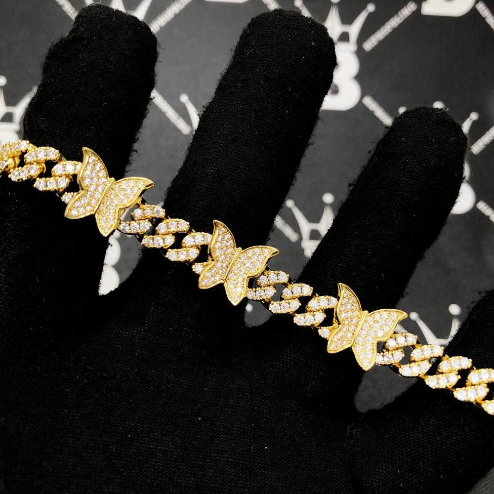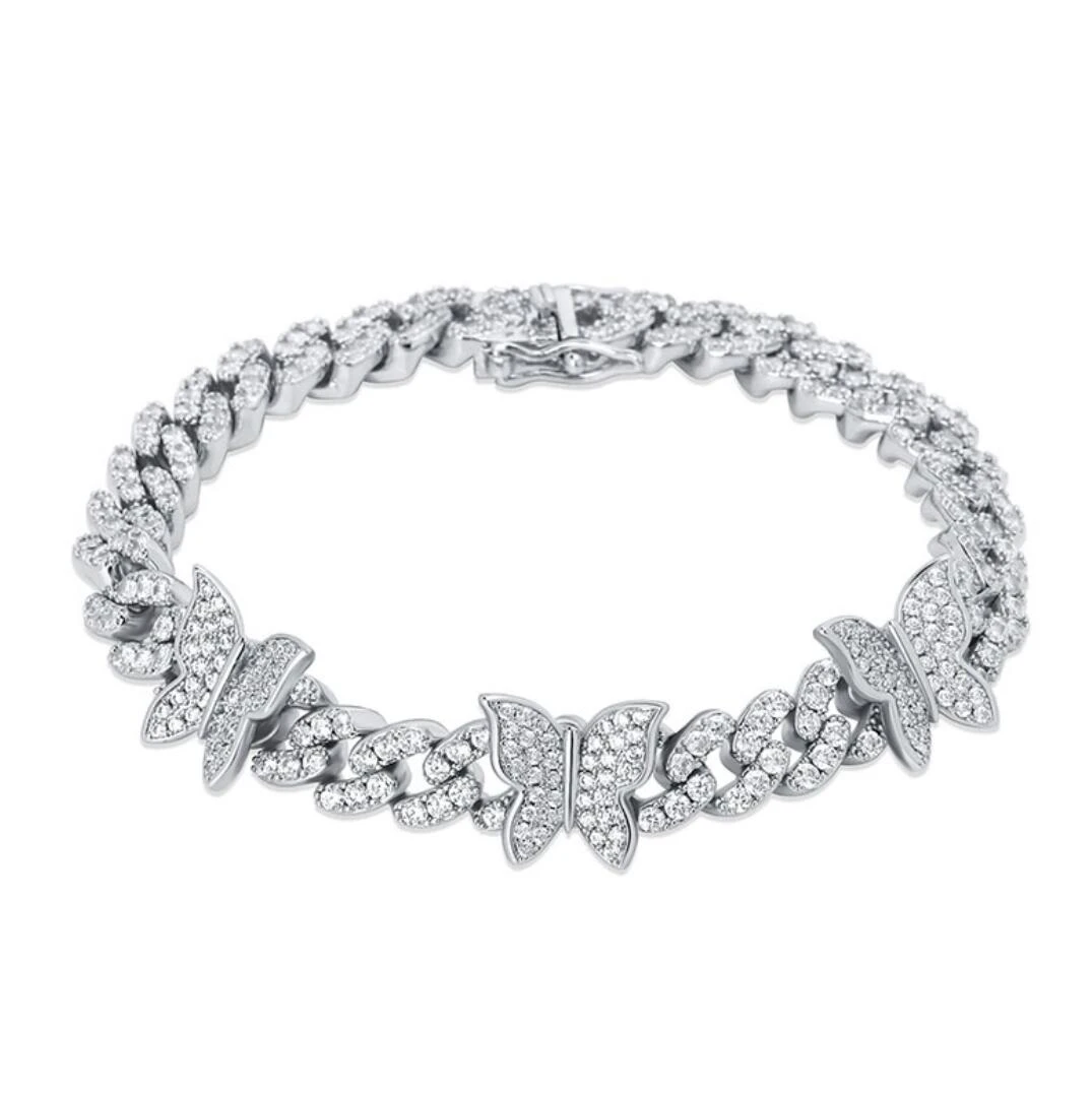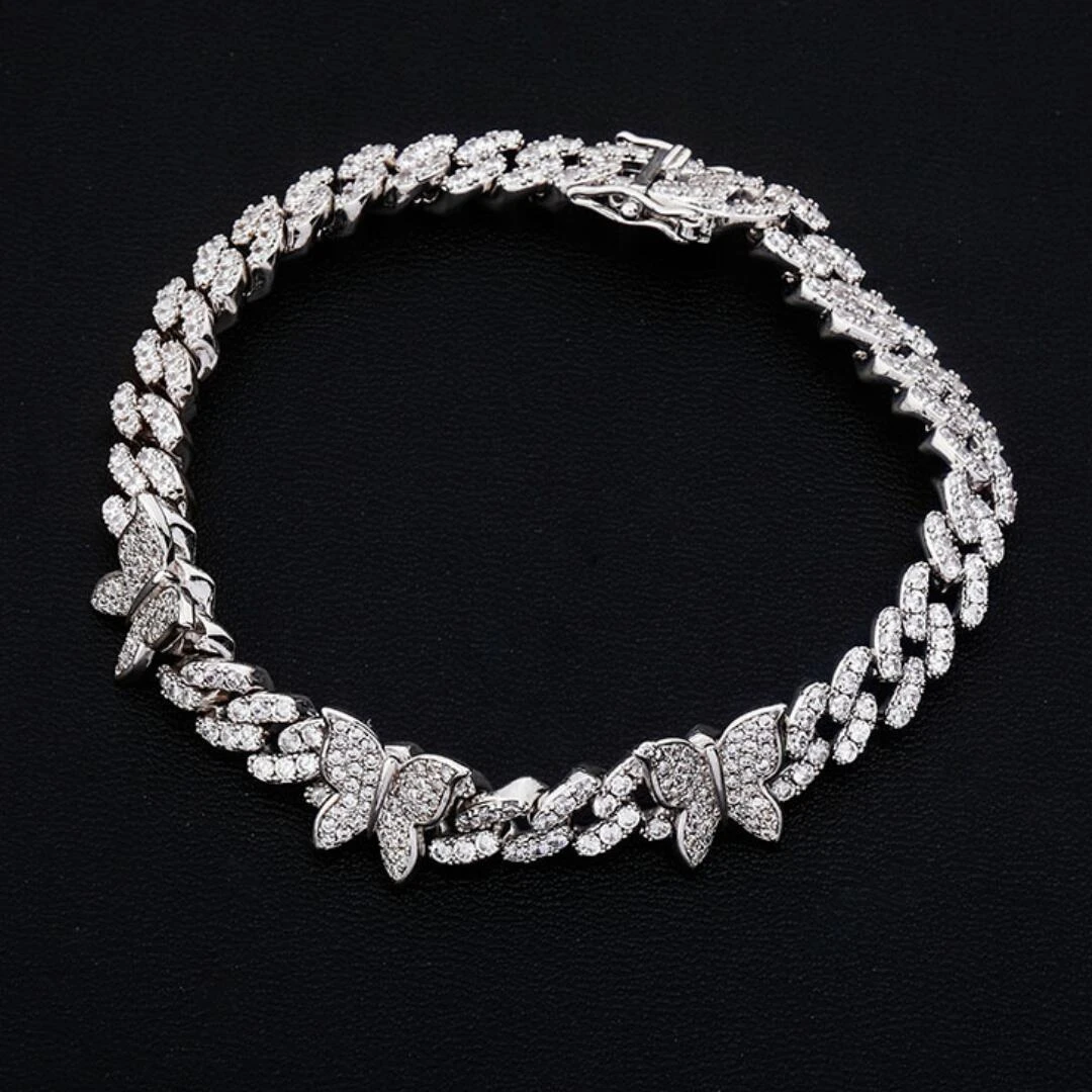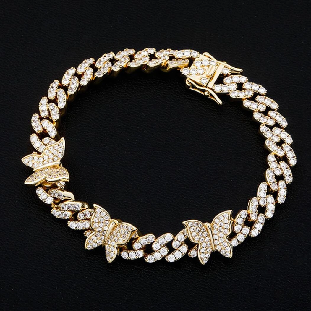 Cuban Link Butterfly Hip Hop Iced Out Bracelet. Classic and Unique Style Bling Bling Bracelet. Incredibly icy with VVS simulated diamond stones lighting up your wrist with the best shine possible. This iced out Bracelet shines like genuine diamonds. All hand setting, no glue. Hand Crafted to look, feel, and Shine Like Genuine Diamond Hip Hop Jewelry. Shine with the best hip hop jewels in the game.