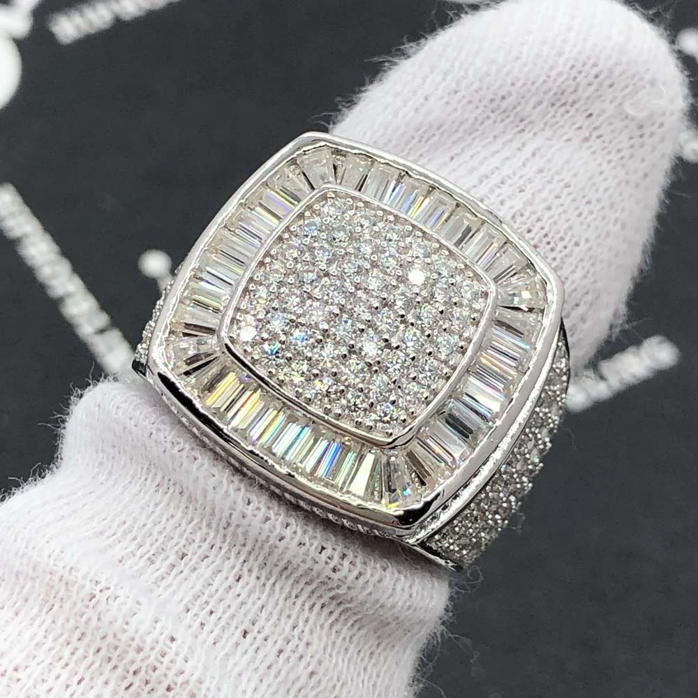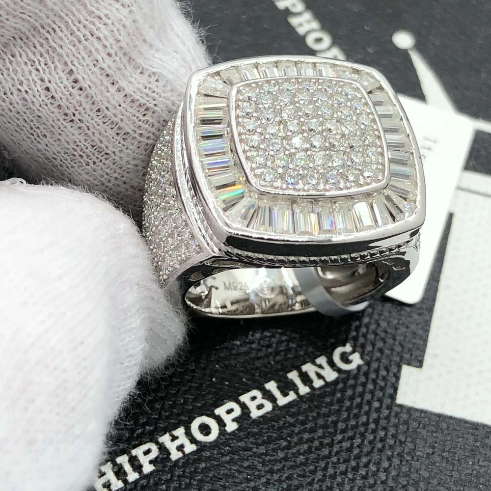 Cushion Baguette Iced Out VVS Moissanite Ring .925 Sterling Silver. This iced out Moissanite Cuban link ring is simply breathtaking and displays an incredible bling bling shine. We insisted on using the finest Moissanite stones available to craft this perfect high end ‘diamond’ bling bling Moissanite Micro Pave iced out ring. Moissanite stones are carbon based stones just like real Diamonds. The benefit of our Moissanite hip hop jewelry is that you get a better shine for much less money than genuine Diamonds. Our Moissanite Stones have a higher refractive index than real Diamonds and rank 9-9.5 on Mohs hardness scale.