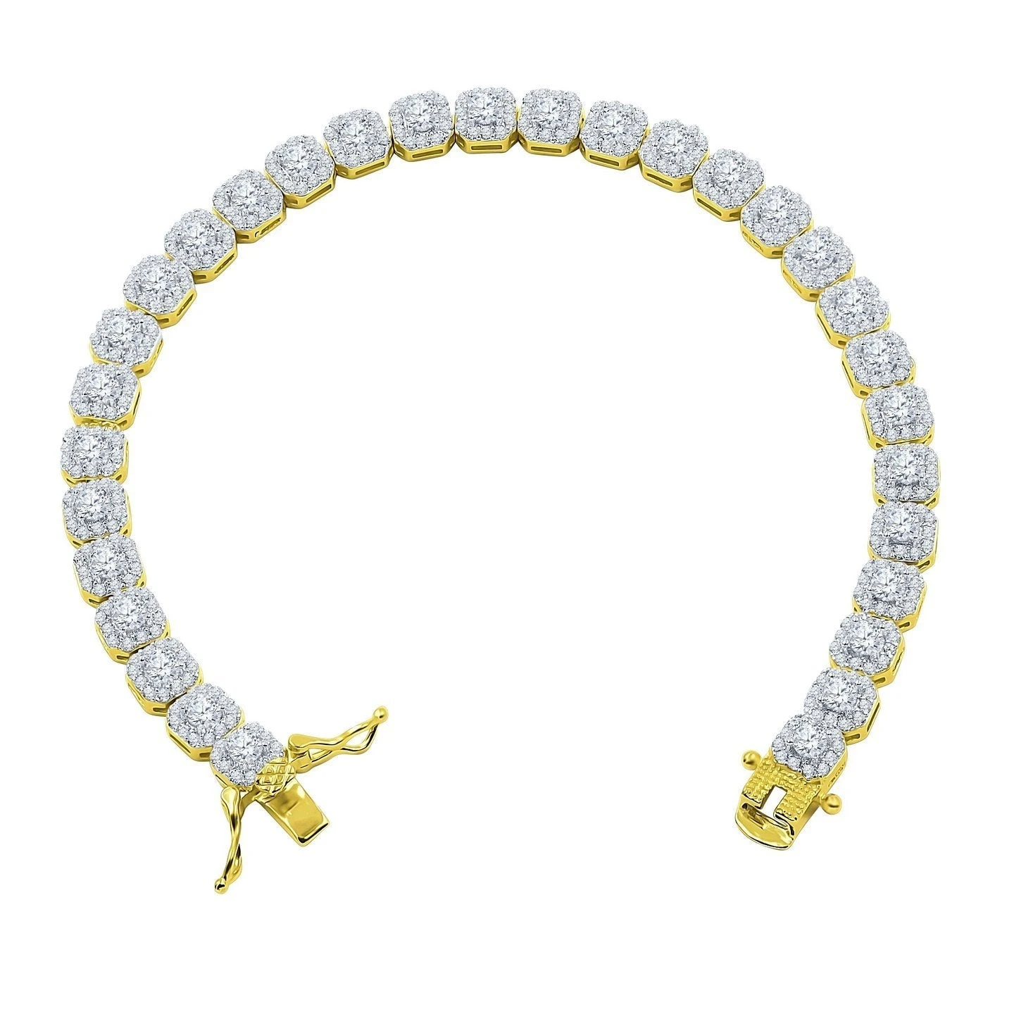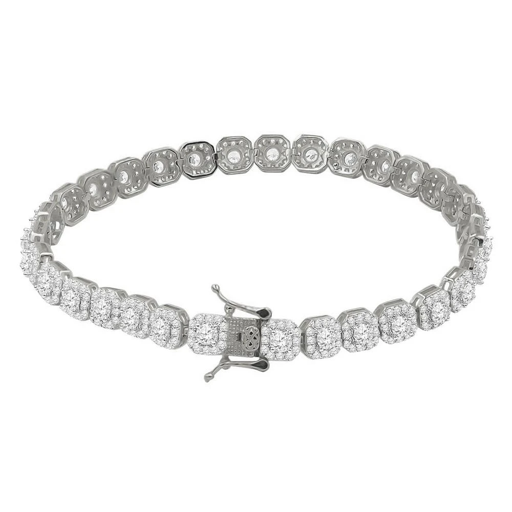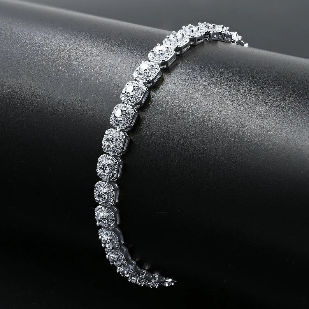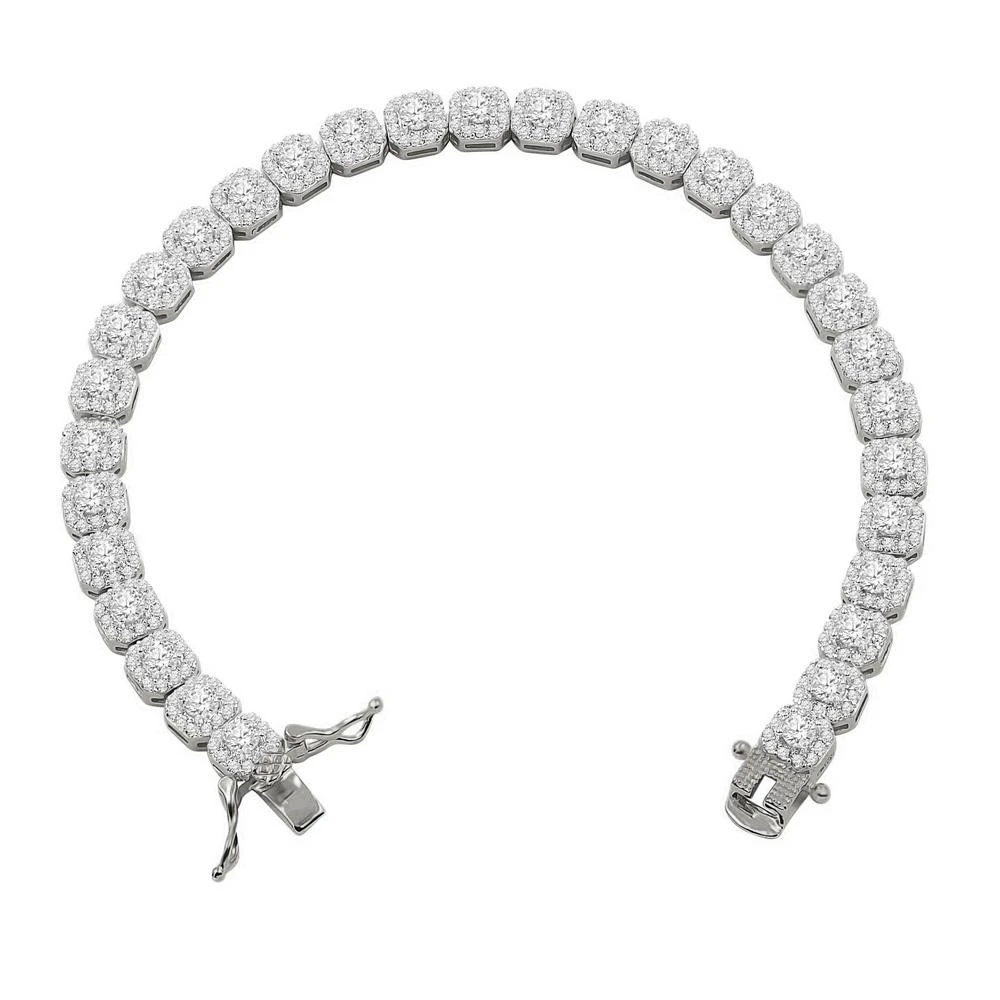 Cushion Cluster CZ Iced Out Bracelet .925 Sterling Silver. Crafted with fine .925 Sterling Silver and hand polished. Each Simulated Diamond Stone is prong set with keep your stones secure and stay shining. Triple Lock safely clasp keeps your bracelet shining on your wrist. Looks and feels like expensive high end hip hop jewelry.