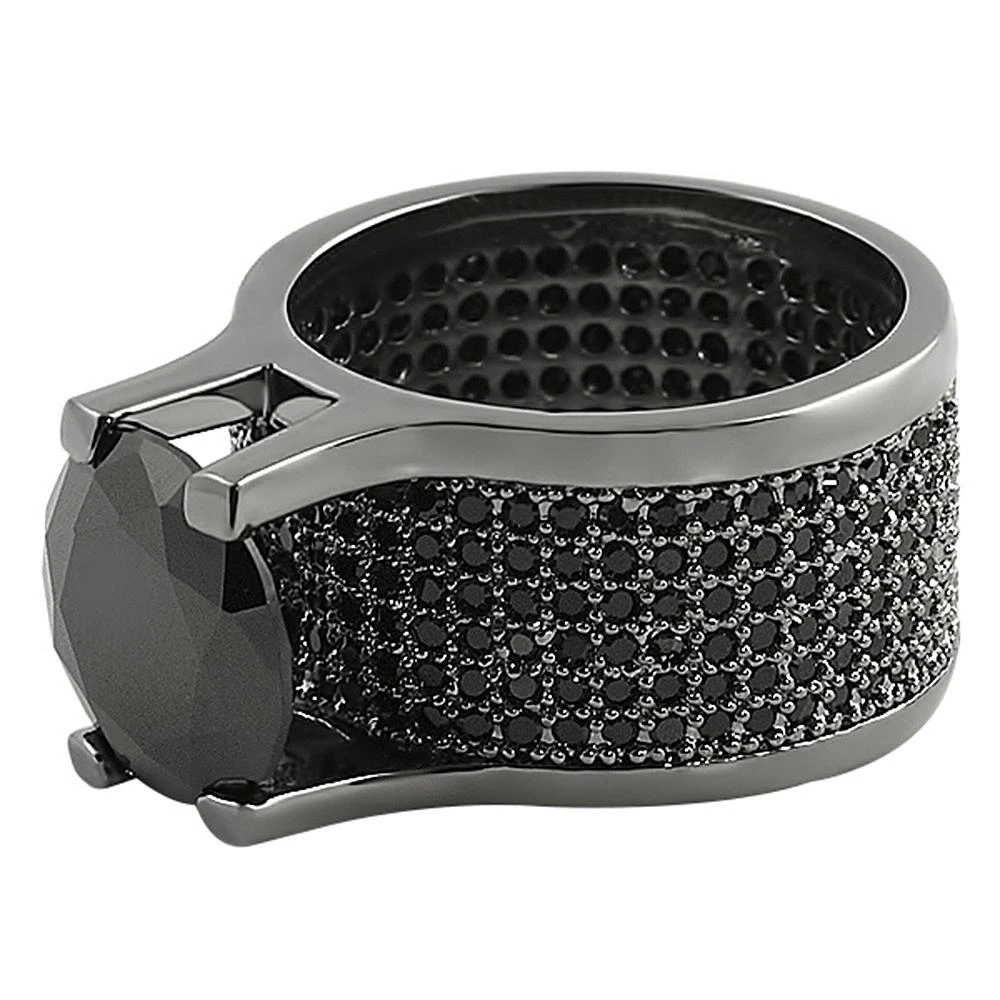 Custom black on black 360 solitaire bling bling ring. This ring is inspired by a $25,000 ring by a celebrity jeweler. This ring uses quality diamond simulated stones to look and feel like the real deal. There are 6 rows of shiny stones going all the way around the entire band (even under the large solitaire!!) The center stone is raised and set above the ring. All stones are prong set. Look like a million bucks with this ring. The bling bling shine is insane. Choose from Sizes 7-12, ice up your pinky or your entire hand, it’s up to you.