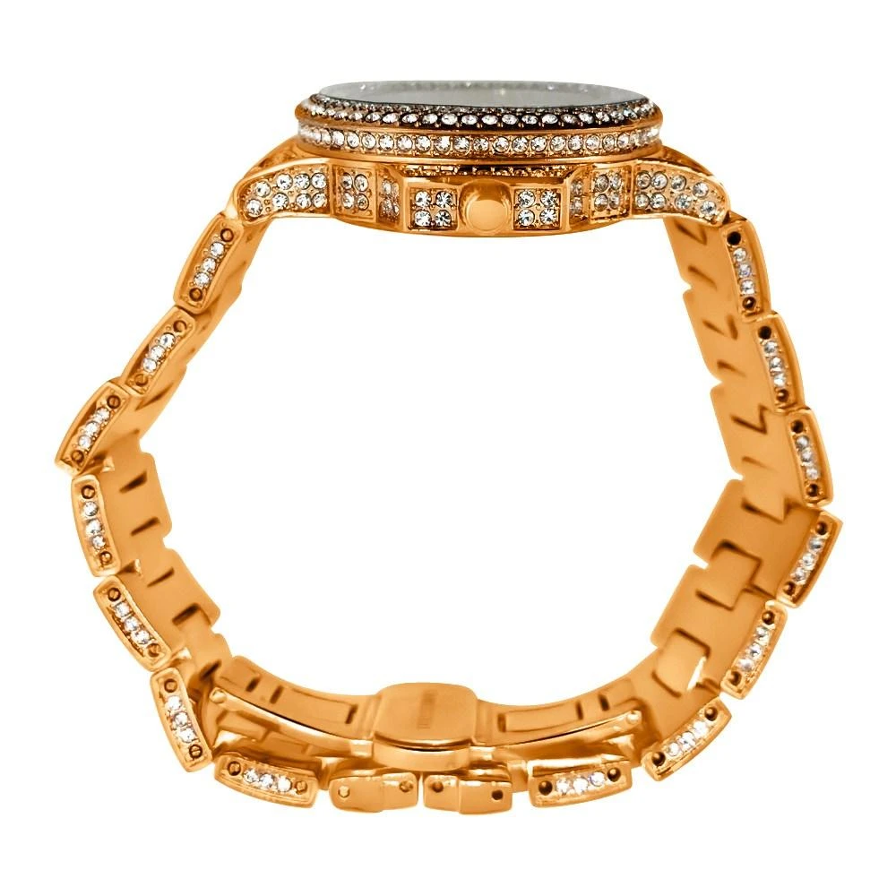 Bling Bling Rose Gold Fully Custom Ice Blizzard Watch. Incredible bling bling shine on this rose gold hip hop watch. Iced out with almost 1500 Simulated diamond Czech Crystal Stones covering the dial (baguette stone hour markers), bezel, side of bezel, lugs, case, band, and even the side of the band!. Incredible details with a luxury feel. Features a Stainless Steel Butterfly Clasp for that high end look and feel. This bling bling watch is made on a much higher quality level than the rest of the watches out there. Better, long lasting Rose Gold color, brighter shine, and full stone coverage. Order your Rose Gold Ice Blizzard Bling Bling Watch Today.