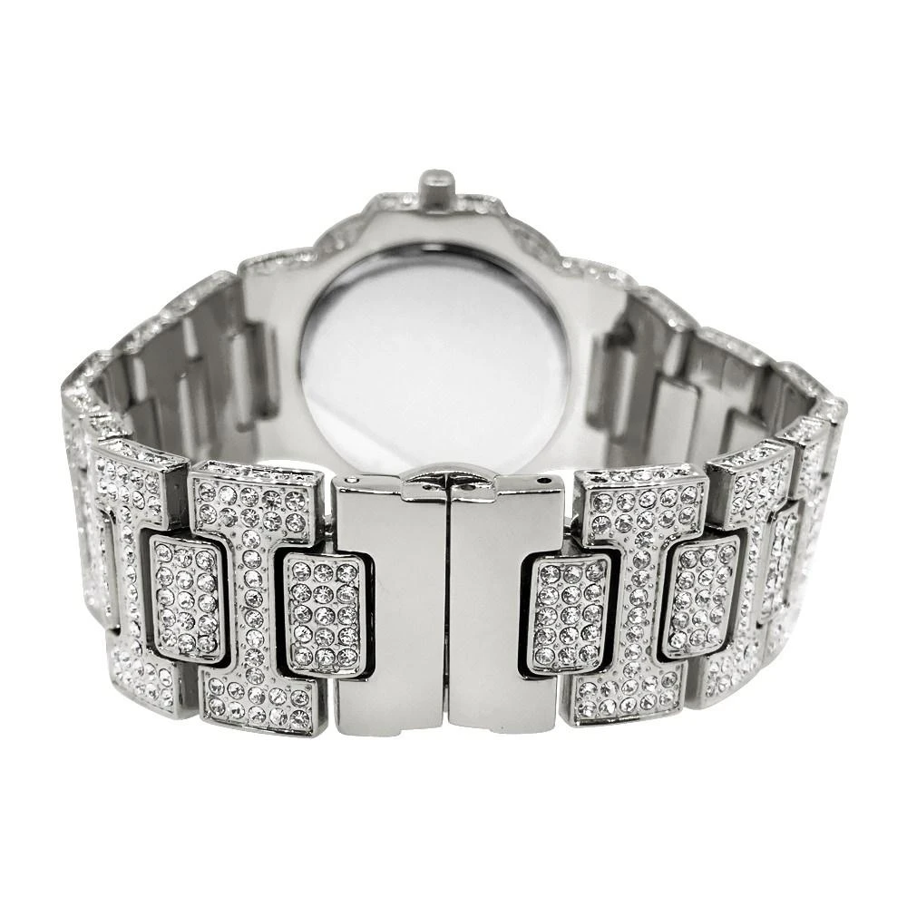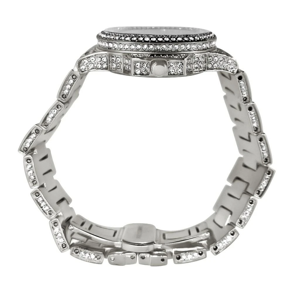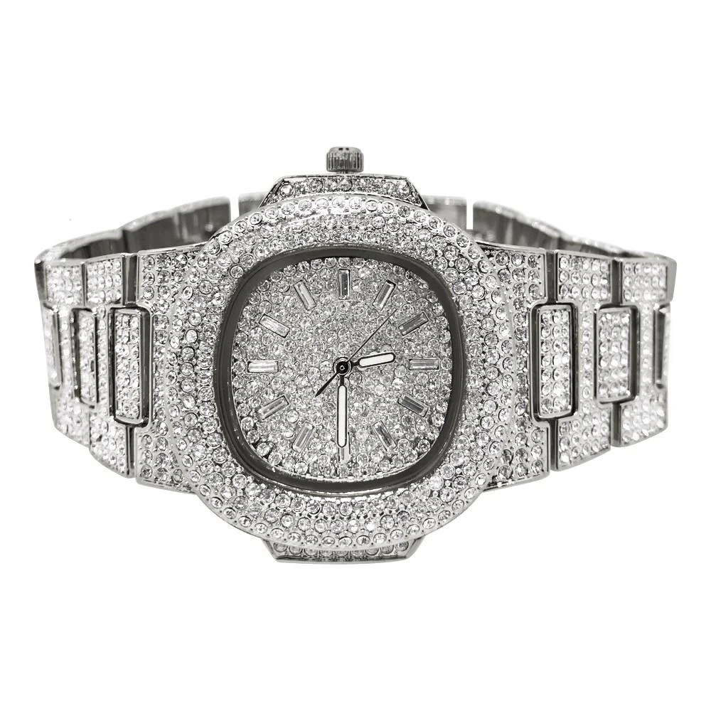 Bling Bling Silver Fully Custom Ice Blizzard Watch. Incredible bling bling shine on this silver hip hop watch. Iced out with almost 1500 Simulated diamond Czech Crystal Stones covering the dial (baguette stone hour markers), bezel, side of bezel, lugs, case, band, and even the side of the band!. Features a Stainless Steel Butterfly Clasp for that high end look and feel. This bling bling watch is made on a much higher quality level than the rest of the watches out there. Better, long lasting Rhodium Silver color, brighter shine, and full stone coverage. Order your Silver Ice Blizzard Bling Bling Watch Today.