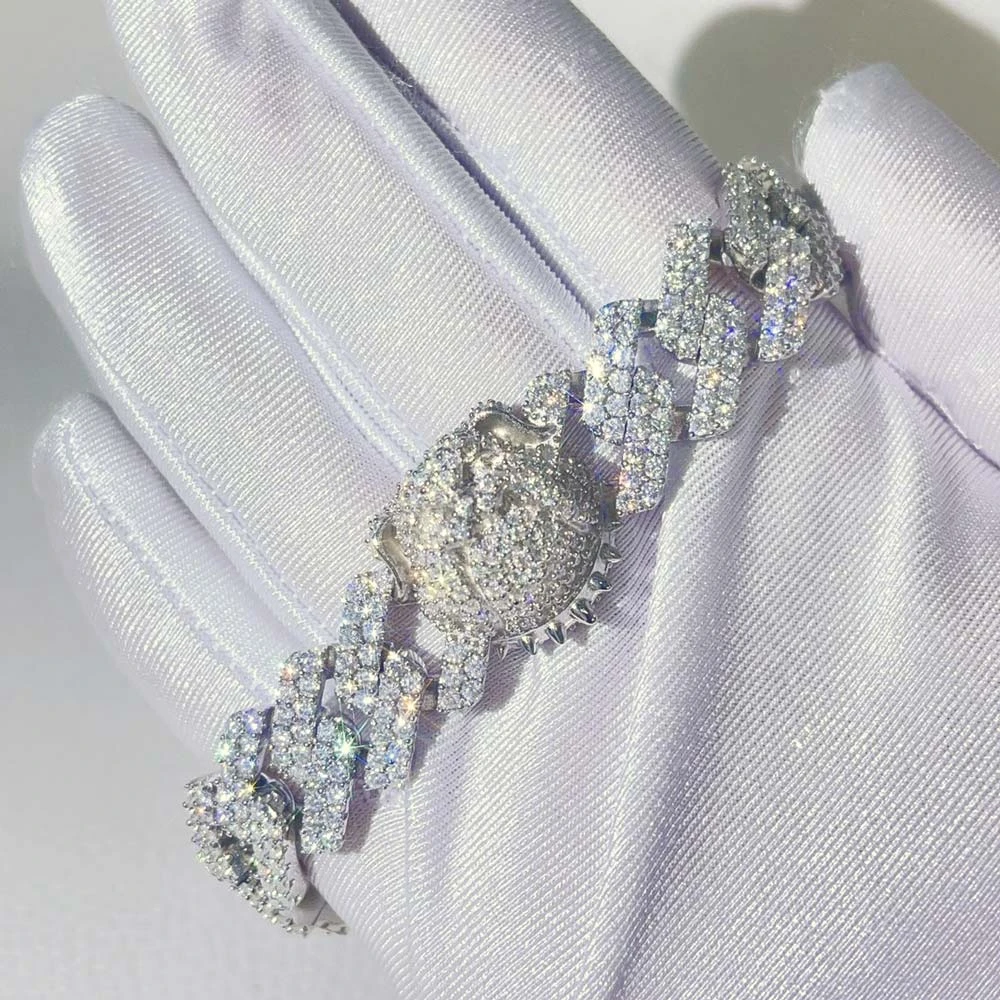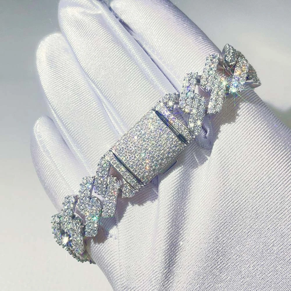 Get your very own custom charm bracelet using our best selling popular Moissanite Sharp Cuban Link Iced Out Bracelet 15MM in .925 Sterling Silver. This iced out Cuban Bracelet is simply breathtaking and displays an incredible bling bling shine. We insisted on using the finest Moissanite stones available to craft these perfect high end ‘diamond’ Iced Out Cuban Link bracelets. Moissanite stones are carbon based stones just like real Diamonds*. The benefit of our Moissanite Cuban Link bracelets are that you get a better shine for much less money. Our Moissanite Stones have a higher refractive index than real Diamonds and rank 9.5 on Mohs hardness scale.