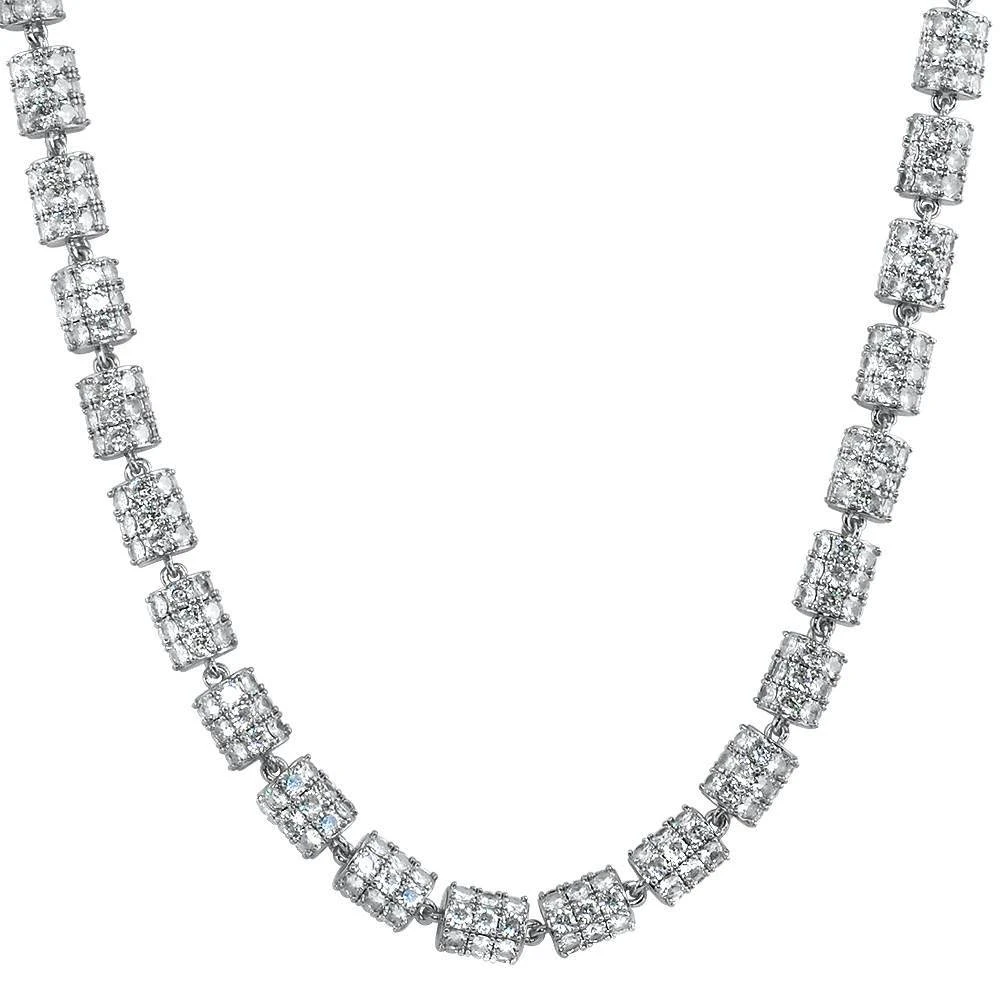 Cylinder Link Iced Out CZ Hip Hop Bling Bling Chain. Unique 3D Iced Out Cylinder Chain with a Multi Angle Bling Bling Shine. Highly detailed with intricate details and stone setting. All stones are VVS Simulated Diamonds that are prong set.