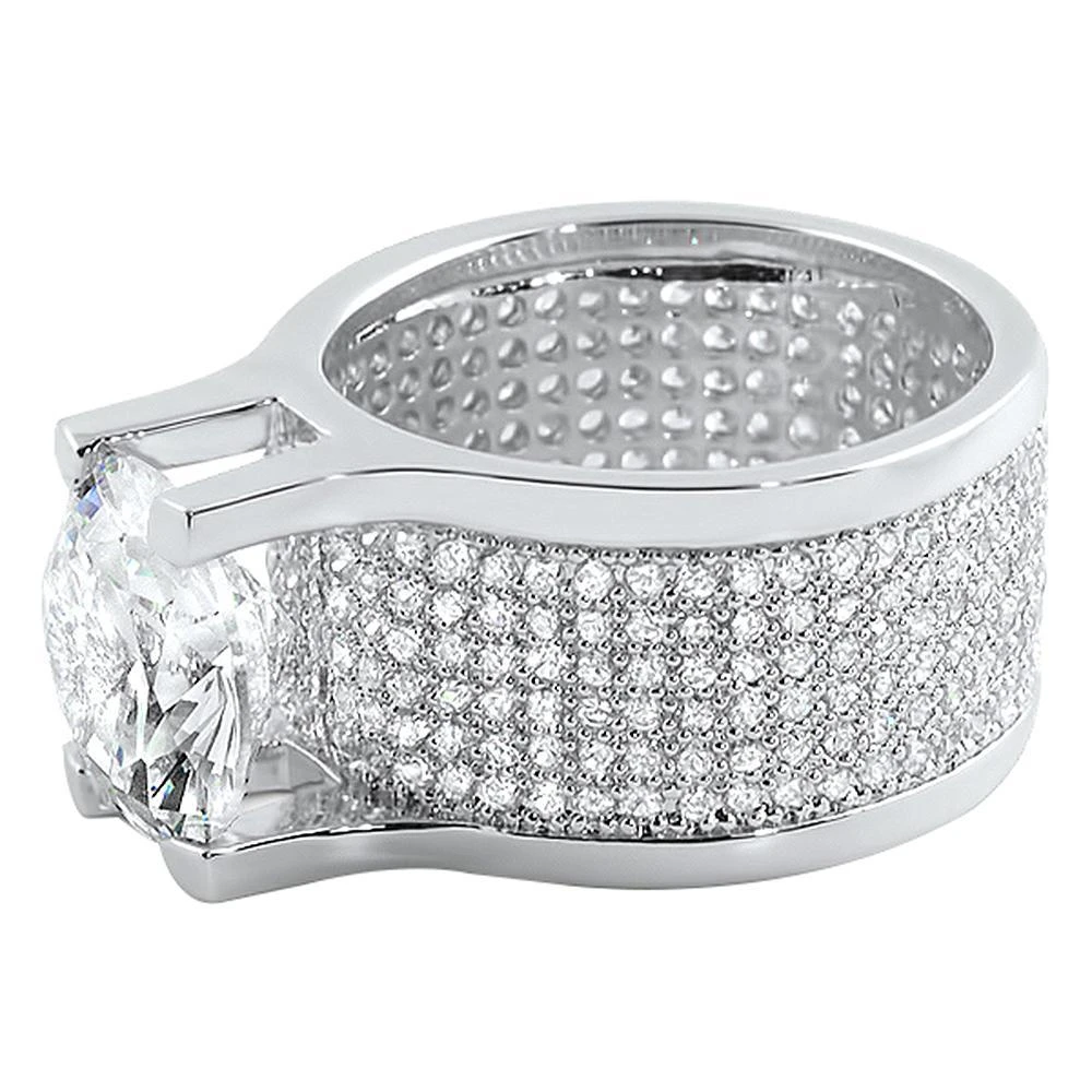 Custom 360 solitaire bling bling ring. This ring is inspired by a $25,000 ring by a celebrity jeweler. Features a total 20 carats of lab created diamond simulated stones. This hip hop ring uses quality diamond simulated stones to look and feel like the real deal. There are 6 rows of shiny stones going all the way around the entire band (even under the large solitaire!!) The center stone is raised and set above the ring. All stones are prong set. Rhodium dipped for a lasting platinum like shine. Look like a million bucks with this ring. The bling bling shine is insane. Choose from Sizes 7-12, ice up your pinky or your entire hand, it’s up to you.
