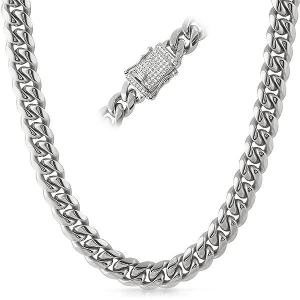 CZ Diamond Lock 12MM Cuban Chain Stainless Steel. Never tarnish or fade Hip Hop Cuban Bracelet with the CZ Diamond Lock. All stones are prong set into the lock. The Clasp is a triple lock to keep this bling blingchain securely on your neck. Get the look and the value of a Genuine Platinum and Diamond Cuban Bracelet that costs thousands and has the same non tarnishing and prong set shining stone properties, for a fraction of the cost. Bling up your neck by ordering this Hip Hop Chain now. Big Look for little money.