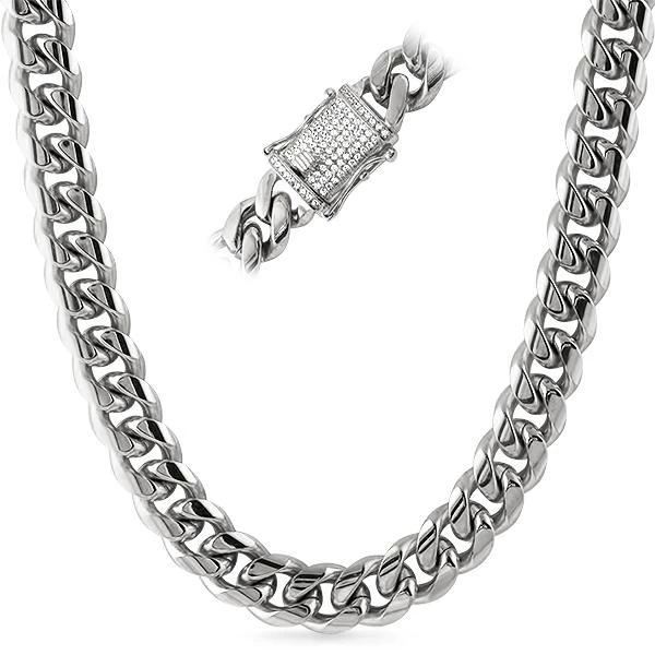 No Fade CZ Diamond Lock 14MM Cuban Chain Stainless Steel. Never tarnish or fade Hip Hop Cuban Bracelet with the CZ Diamond Lock. All stones are prong set into the lock. The Clasp is a triple lock to keep this bling blingchain securely on your neck. Get the look and the value of a Genuine Platinum and Diamond Cuban Bracelet that costs thousands and has the same non tarnishing and prong set shining stone properties, for a fraction of the cost. Bling up your neck by ordering this Hip Hop Chain now. Big Look for little money.