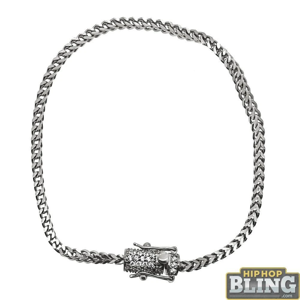 No Fading No Tarnishing Mini Franco CZ Diamond Lock Clasp Bracelet. Very low key bracelet with a burst of bling around the lock. You can wear this with anything it is so versatile. Made from Solid Stainless Steel and high polished so you know it will stay shining. The Franco part of the bracelet measures 2.5MM wide and the lock is about 6MM wide. Ice up your wrist today with the freshest bling bling jewelry. We got what you need at HipHopBling.com
