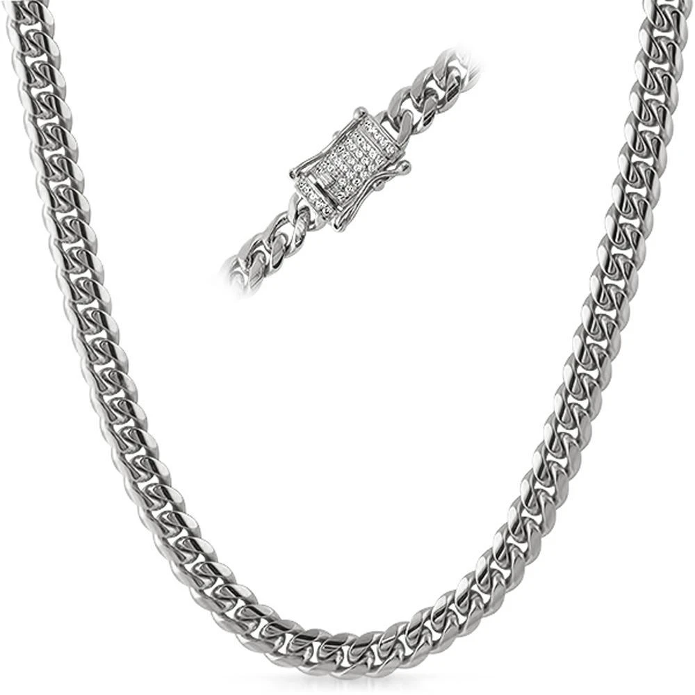 CZ Diamond Lock 8MM Cuban Chain Stainless Steel. Never tarnish or fade Hip Hop Cuban Bracelet with the CZ Diamond Lock. All stones are prong set into the lock. The Clasp is a triple lock to keep this bling blingchain securely on your neck. Get the look and the value of a Genuine Platinum and Diamond CubanNecklace that costs thousands and has the same non tarnishing and prong set shining stone properties, for a fraction of the cost. Bling up your neck by ordering this Hip Hop Chain now. Big Look for little money.
