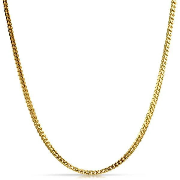 Gold Franco 3MM hip hop chain. Crafted from Stainless Steel and high polished, then IP Gold plated to make it look real and stay lasting. This chain looks almost the same as a $400 solid gold Franco chain. The Franco chain is one of the most popular chain in the past 5 years. The franco hip hop chain looks amazing with out mini bling bling pendants. Order yours today!