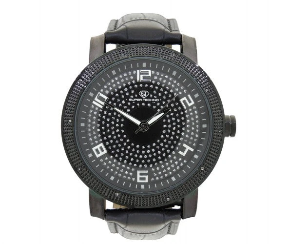 Super Techno offers the hottest hip hop diamond watches. This beautiful watch has 10 genuine diamonds around the bezel. Black hip hop jewelry is very popular. This black hip hop watch is sure to turn heads. For a very affordable price you can have your very own real diamond hip hop watch. It is very heavy built and designed to last. It has a hard sapphire crystal to resist scratching and breaking. The time is powered by a high end Japanese quartz movement. This watch comes with a box and 2 extra watch bands.Manufactured by Joe Rodeo, A Revolution in Diamond Watch manufacturing. HipHopBling.com is an Authorized Distributor of Joe Rodeo Diamond Watches, JoJino Watches, and Super Techno Diamond Watches. This Super Techno Diamond timepiece features: