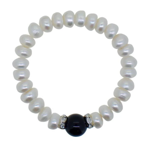 Genuine freshwater pearl bracelet with a black natural stone. Each pearl is naturally grown, these are not imitations. This bracelet in particular features button pearls which are flat oval shaped. These button freshwater pearls go all the way around the bracelet with an added black natural gemstone arorned by crystal rings on each side of it. This modern style to a classic bracelet will give your wrist a stunning and unque look. Order yours today!