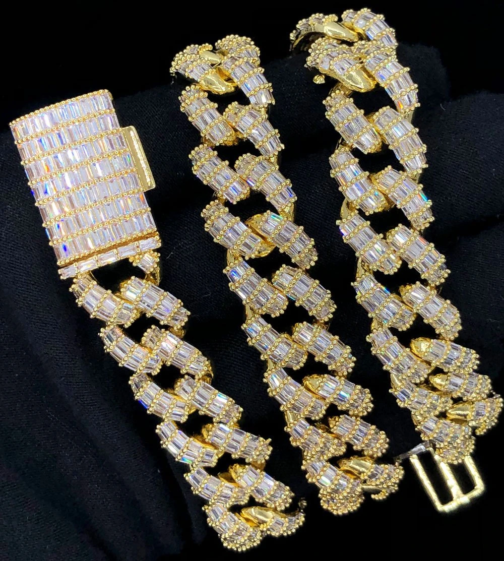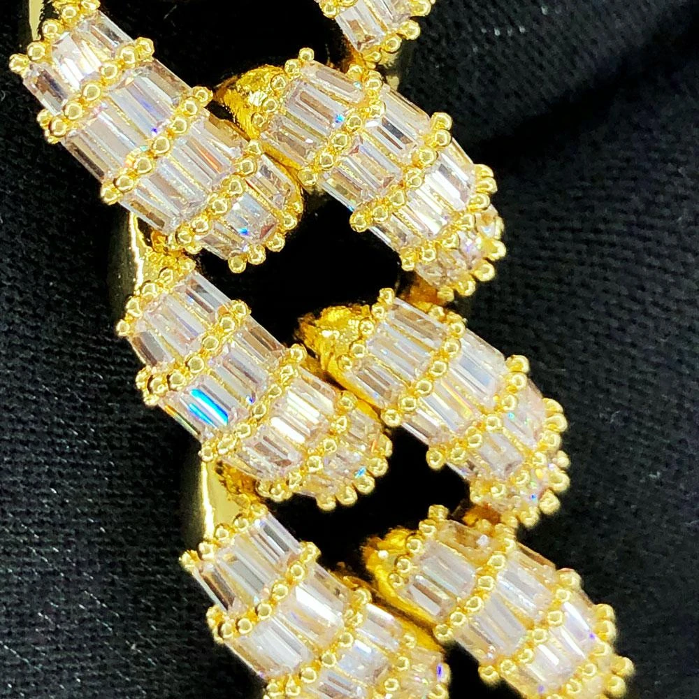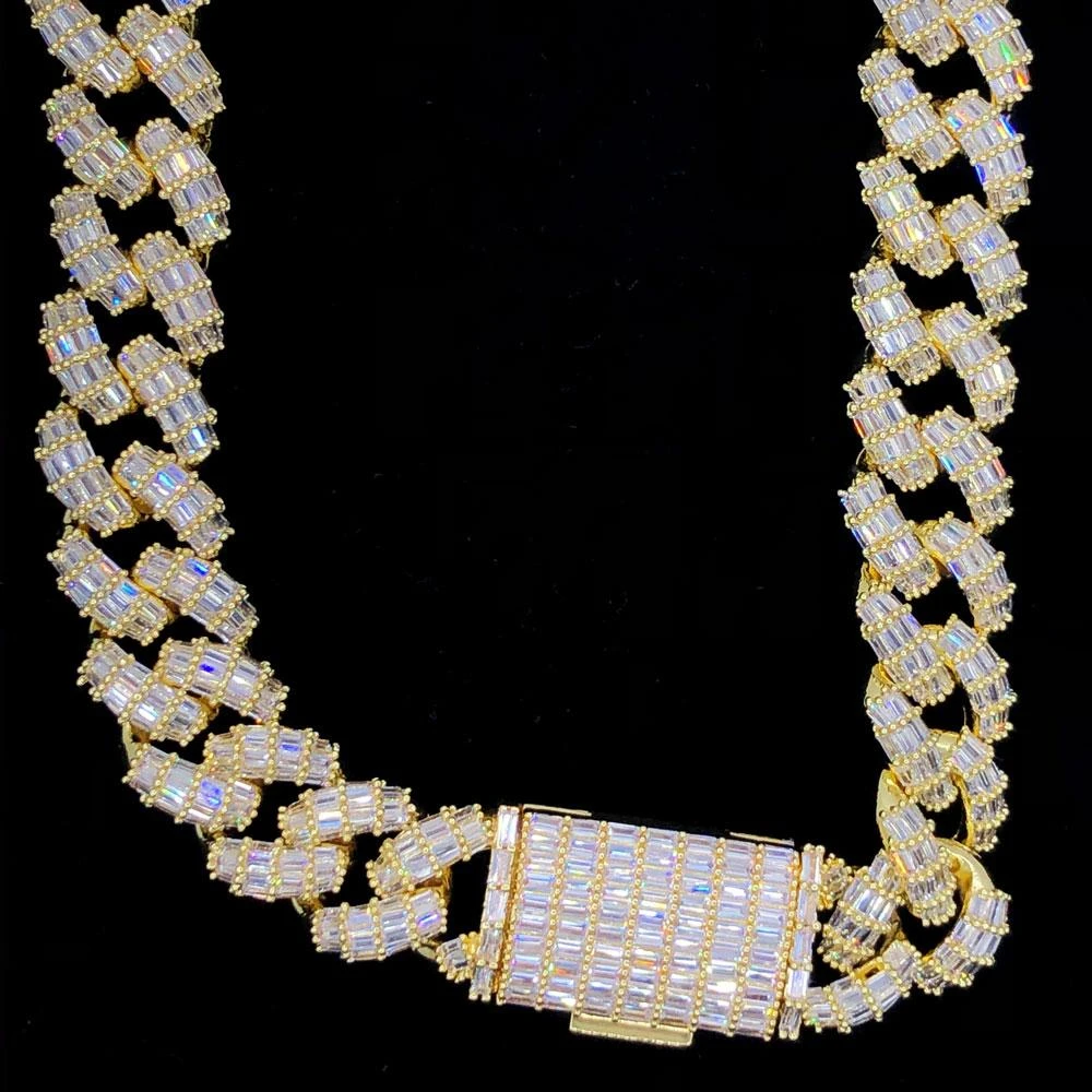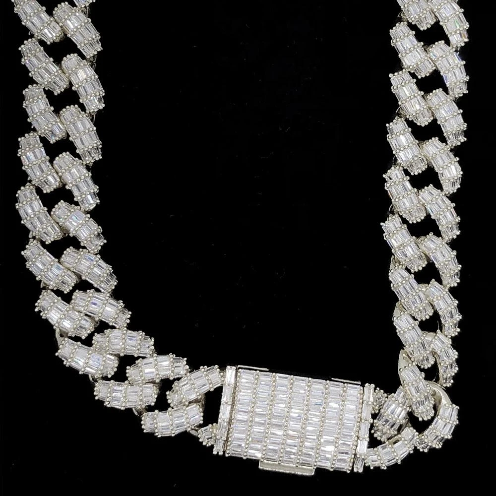Full Baguette Cuban Hip Hop Bling Bling CZ Iced Out Chain. This unique hip hop chain micro pave fully iced out to add maximum shine to your neck. Highly detailed with intricate details and stone setting. All stones are VVS Simulated Diamonds that are prong set.