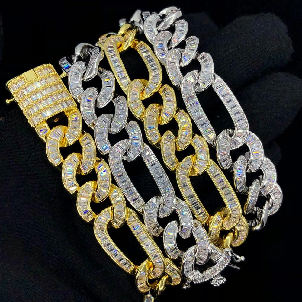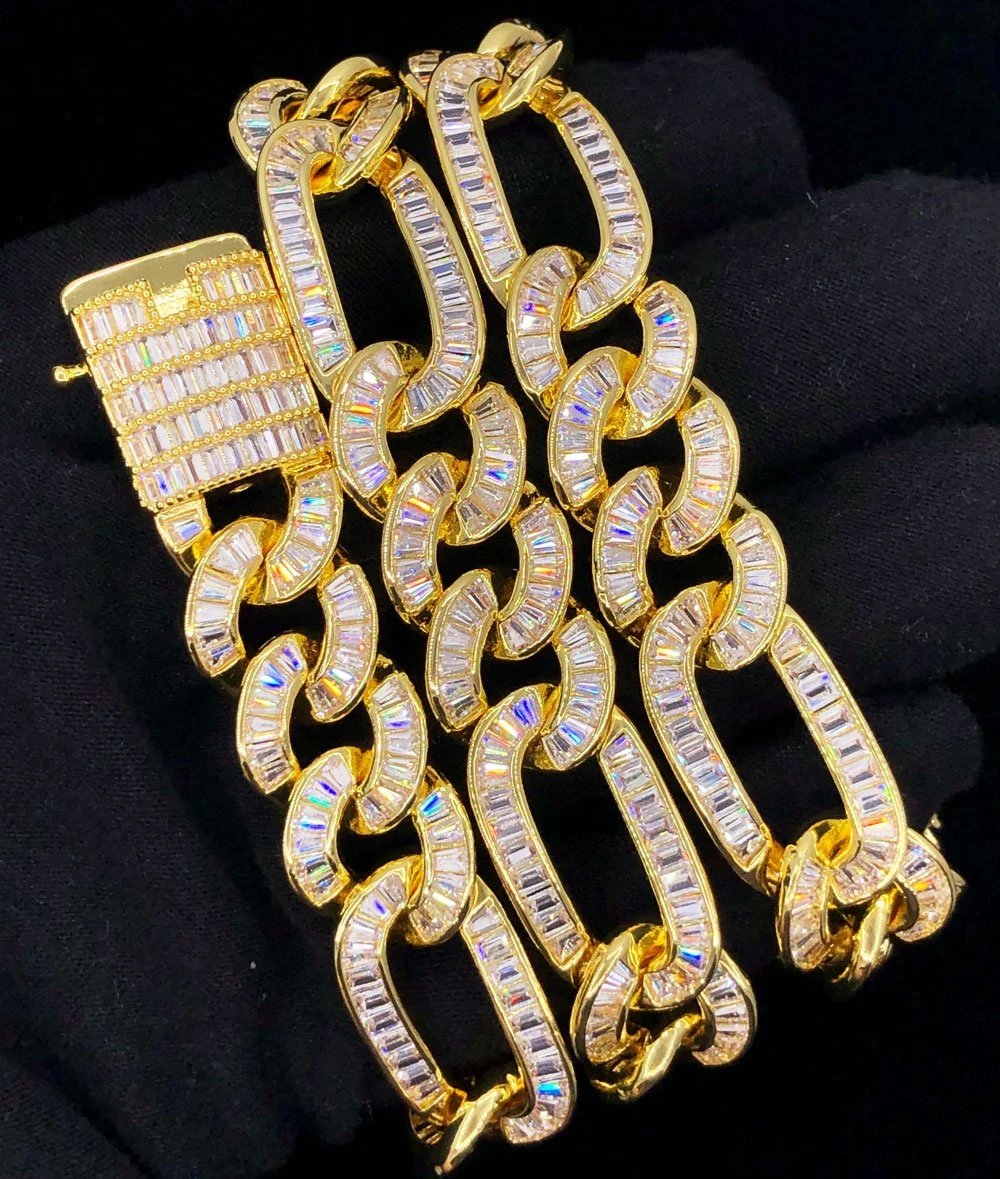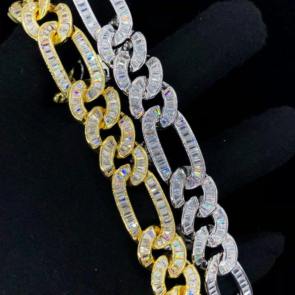Full Baguette Figaro Hip Hop Bling Bling CZ Iced Out Chain full baguette with channel set stones. This unique hip hop chain micro pave fully iced out to add maximum shine to your neck. Highly detailed with intricate details and stone setting. All stones are VVS Simulated Diamonds that are prong set.