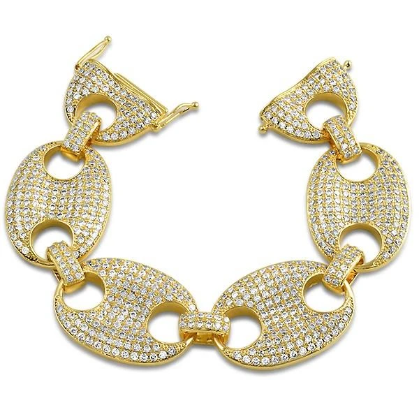 Gold Marine Link CZ Bling Bling Bracelet. This amazing hip hop bracelet is covered in prong set VVS Simulated diamond CZ stones. Shine better with this iced out bracelet around your wrist. Get wrist wear that has the same look as real diamond hip hop jewelry for a fraction of the cost. Order today and shine soon.