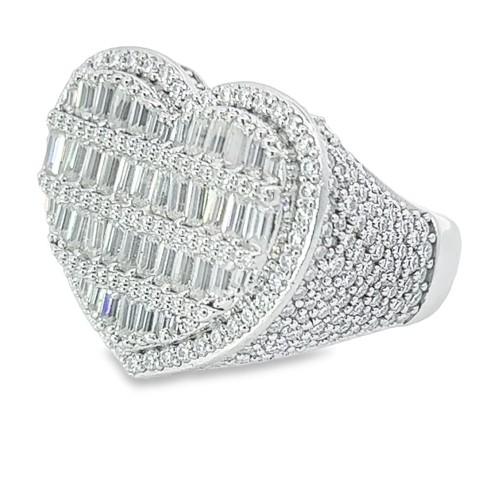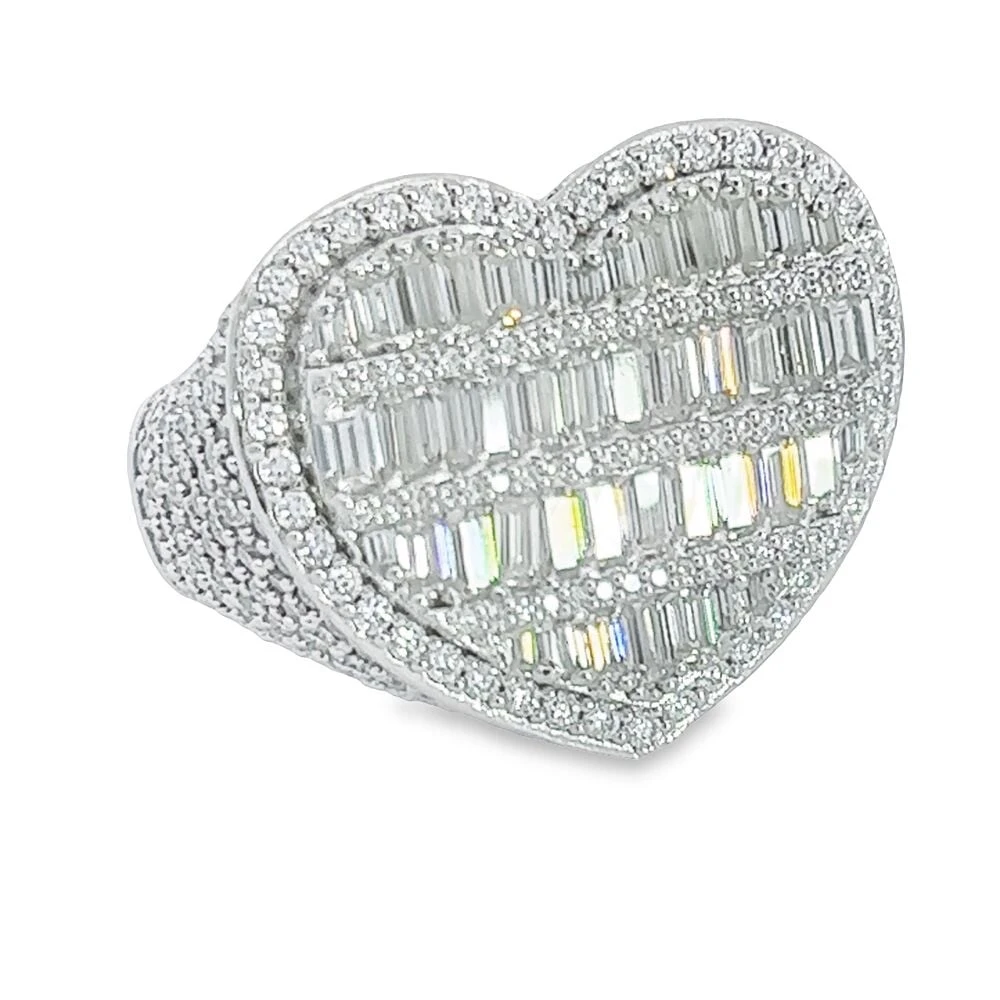 Heart Baguette VVS Moissanite Ring .925 Sterling Silver. Features a polished comfort fitting solid back. This iced out Moissanite Star ring is simply breathtaking and displays an incredible bling bling shine. We insisted on using the finest Moissanite stones available to craft this perfect high end ‘diamond’ bling bling Moissanite Micro Pave unisex eternity band. Moissanite stones are carbon based stones just like real Diamonds. The benefit of our Moissanite hip hop jewelry is that you get a better shine for much less money than genuine Diamonds. Our Moissanite Stones have a higher refractive index than real Diamonds and rank 9-9.5 on Mohs hardness scale. Â