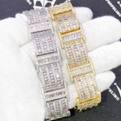 I Bars Baguette VVS Iced Out Hip Hop Bracelet. Classic and Unique Style Bling Bling Bracelet. Hidden butterfly buckle so the ice is continuous around the iced out bracelet. High end quality setting to maximize bling bling shine and look expensive. Incredibly icy with VVS simulated diamond stones lighting up your wrist with the best shine possible. This iced out Bracelet shines like genuine diamonds. All hand setting, no glue. Hand Crafted to look, feel, and Shine Like Genuine Diamond Hip Hop Jewelry. Shine with the best hip hop jewels in the game.