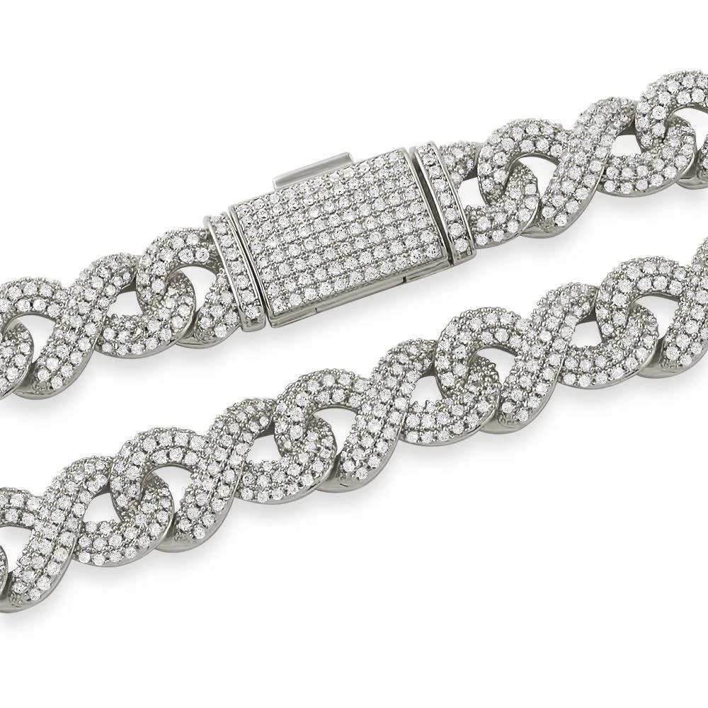 Infinity Link CZ Bling Bling Iced Out Chain. Unique infinity links interwoven into this masterpiece of a chain. Domed micro pave stone setting keeps you icey from all angles. Popular Style with shiny Simulated Diamonds prong set on every link. Top quality Simulated Diamonds and bold style that will keep you shining in the club and other exclusive events. Highly detailed with intricate details and stone setting. All stones are VVS Simulated Diamonds that are prong set.