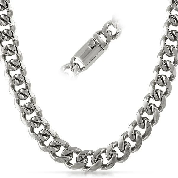 Never tarnish or fade, Miami Cuban hip hop chain with the box clasp. Amazing quality Miami Cuban Chain. The Box clasp gives this chain a very high end look. Imagine this beautiful Miami Cuban Stainless Steel Chain around your neck.