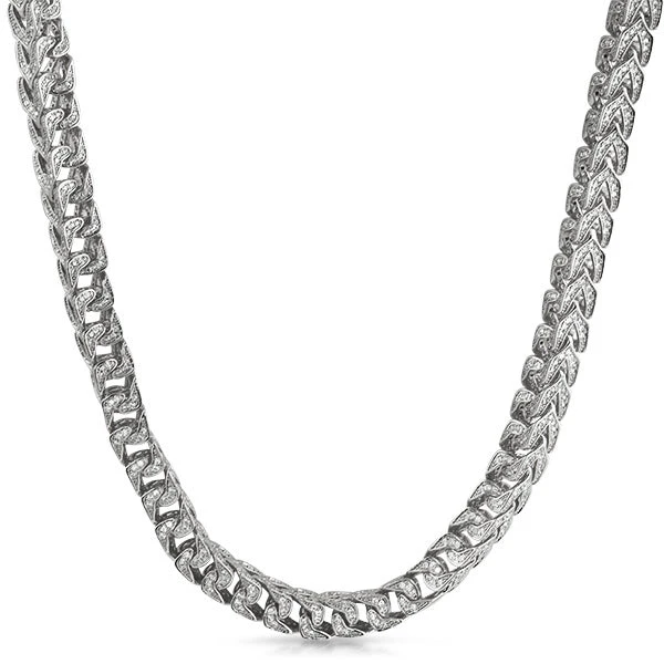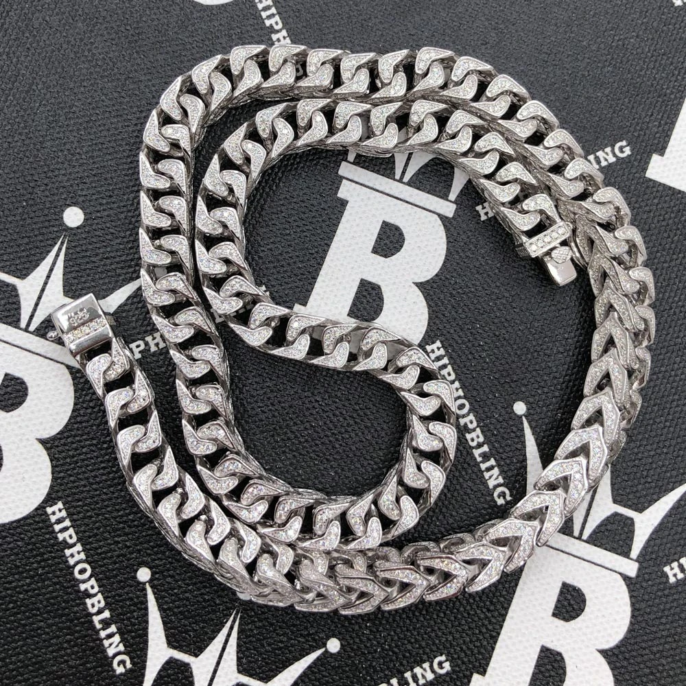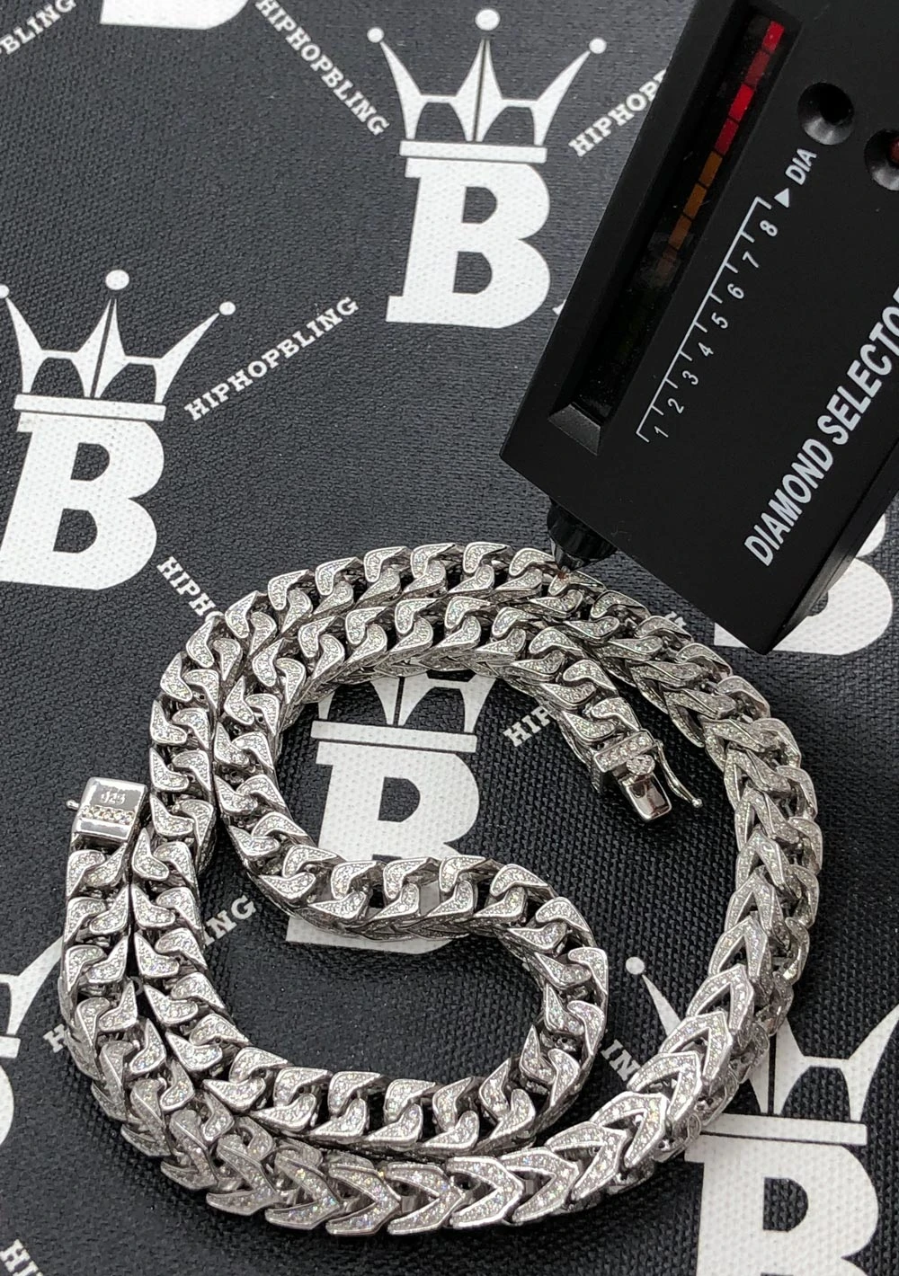 Moissanite Franco Iced Out Chain .925 Sterling Silver. This iced out Chain is simply breathtaking and displays an incredible bling bling shine. We insisted on using the finest Moissanite stones available to craft these perfect high end ‘diamond’ Iced Out Necklaces. Moissanite stones are carbon based stones just like real Diamonds*. The benefit of our Moissanite bling bling Chains is that you get a better shine for much less money. Our Moissanite Stones have a higher refractive index than real Diamonds and rank approximately 9.5 on Mohs hardness scale. Â