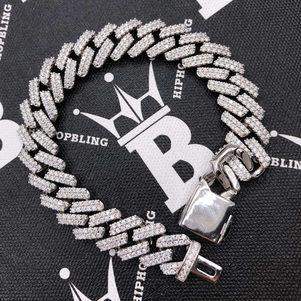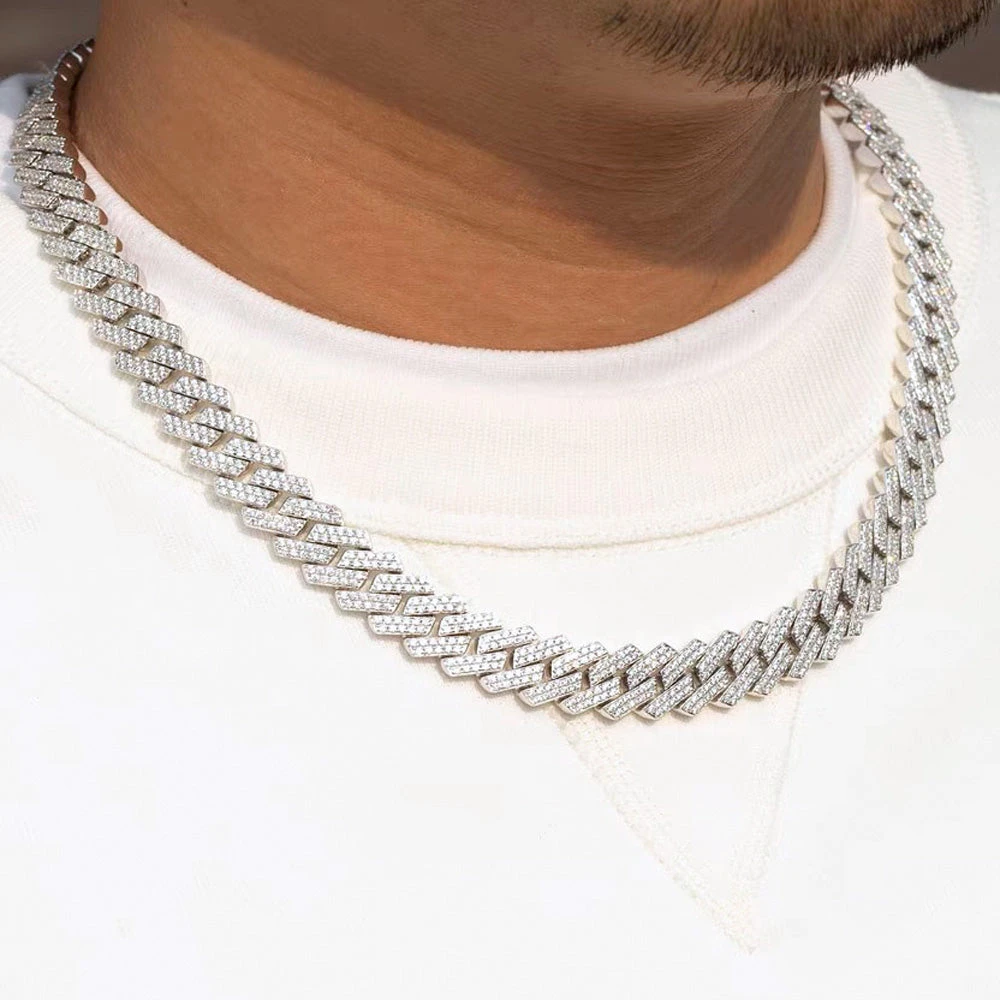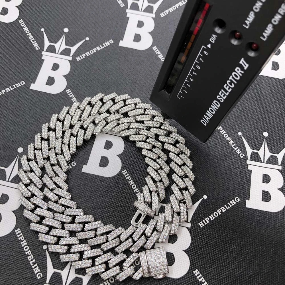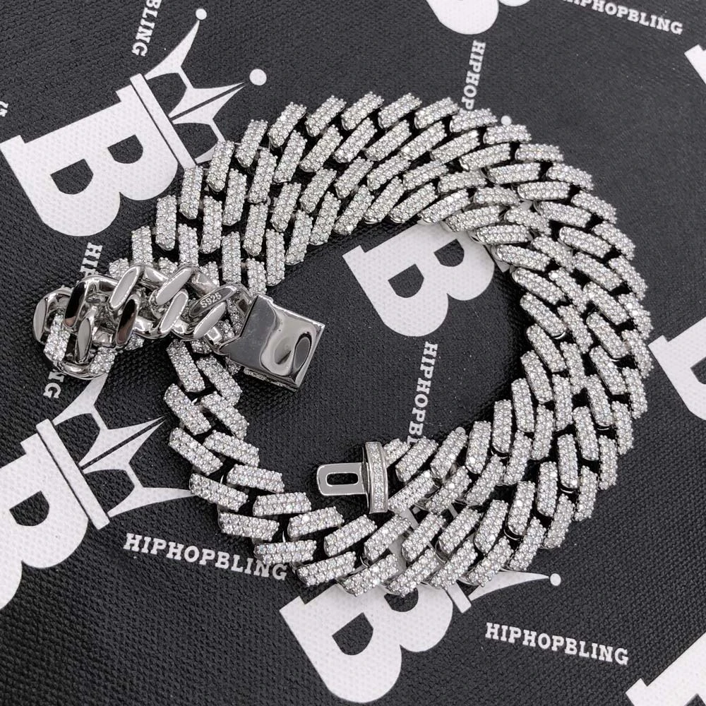 Moissanite Iced Out Cuban Chain Sharp Link 13MM .925 Sterling Silver. This iced out Cuban Chain is simply breathtaking and displays an incredible bling bling shine. We insisted on using the finest Moissanite stones available to craft these perfect high end ‘diamond’ Iced Out Cuban Link Necklaces. Moissanite stones are carbon based stones just like real Diamonds*. The benefit of our Moissanite Cuban Link Chains are that you get a better shine for much less money. Our Moissanite Stones have a higher refractive index than real Diamonds and rank 9.5 on Mohs hardness scale. Â