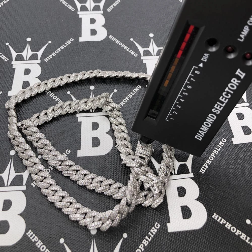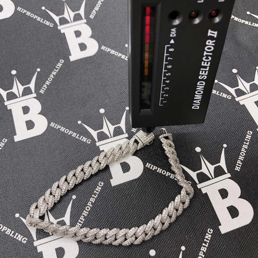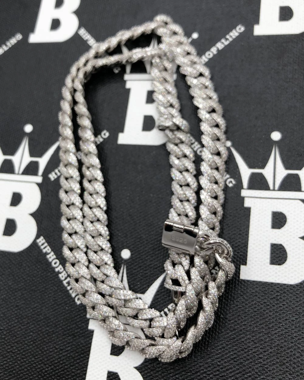 Moissanite Iced Out Miami Cuban Chain Sharp Link 9MM .925 Sterling Silver. This iced out Cuban Chain is simply breathtaking and displays an incredible bling bling shine. We insisted on using the finest Moissanite stones available to craft these perfect high end ‘diamond’ Iced Out Cuban Link Necklaces. Moissanite stones are carbon based stones just like real Diamonds*. The benefit of our Moissanite Cuban Link Chains are that you get a better shine for much less money. Our Moissanite Stones have a higher refractive index than real Diamonds and rank 9.5 on Mohs hardness scale.