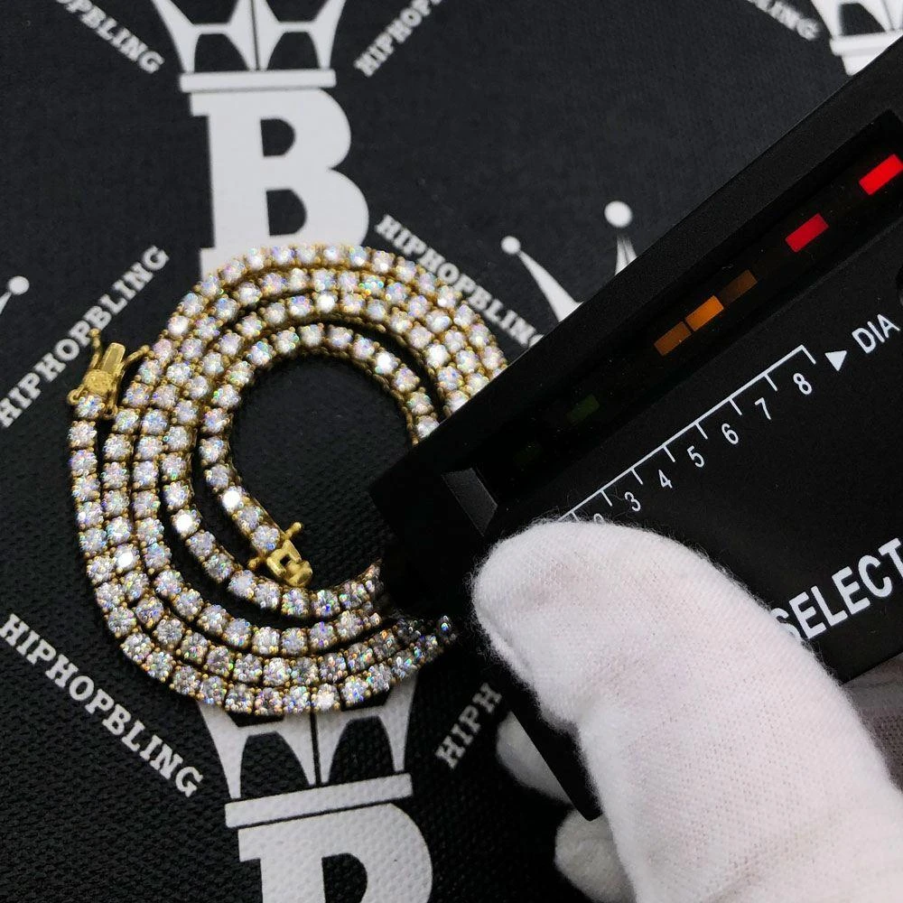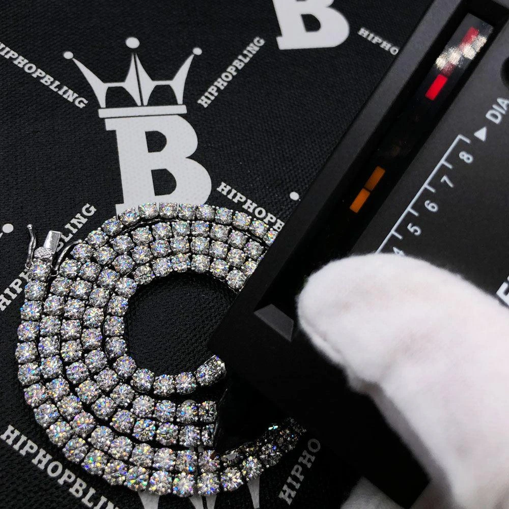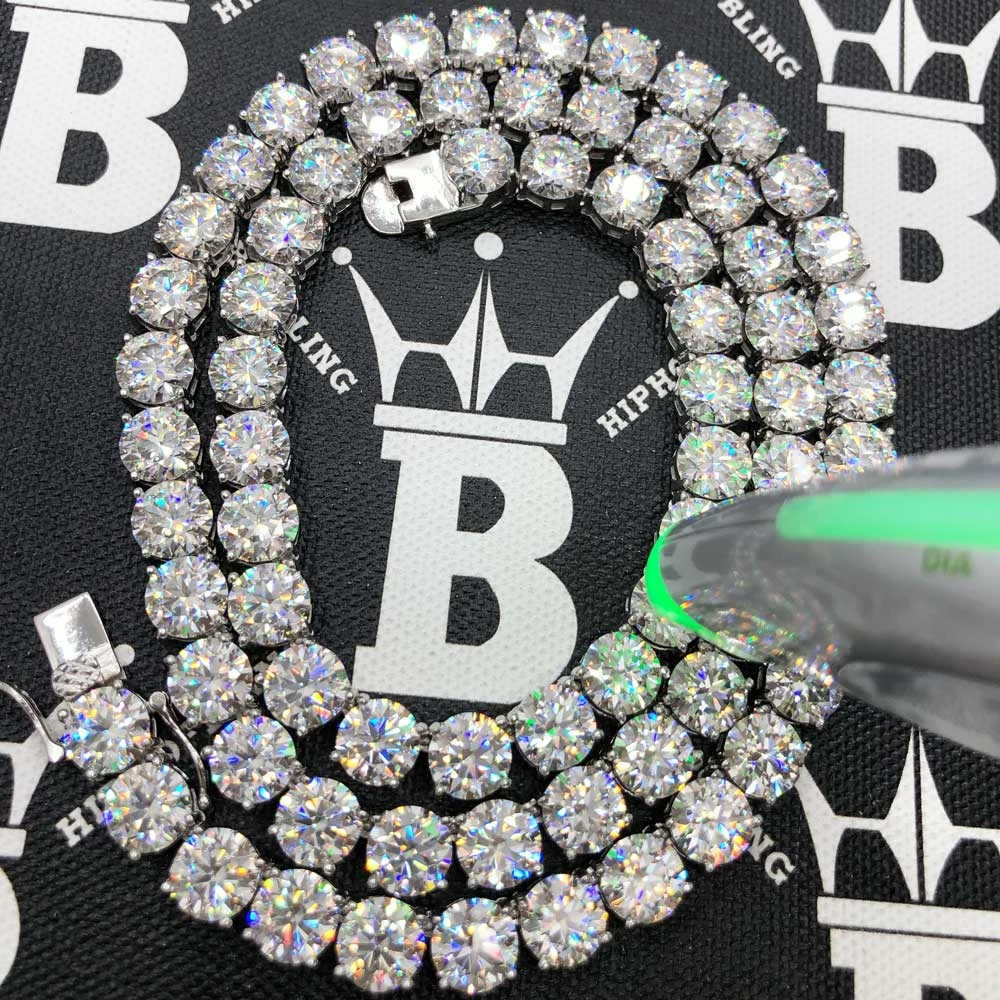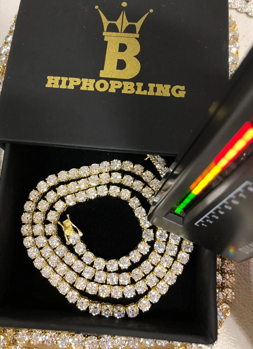 Moissanite VVS D Hand Crafted Tennis Chain Necklace. This iced out Tennis Chain is simply breathtaking and displays an incredible bling bling shine. We insisted on using the finest Moissanite stones available to craft these perfect high end ‘diamond’ Iced Out Tennis Necklaces. Moissanite stones are carbon based stones just like real Diamonds*. The benefit of our Moissanite Tennis Chains are that you get a better shine for much less money. Our Moissanite Stones have a higher refractive index than real Diamonds and rank 9.5 on Mohs hardness scale. Â