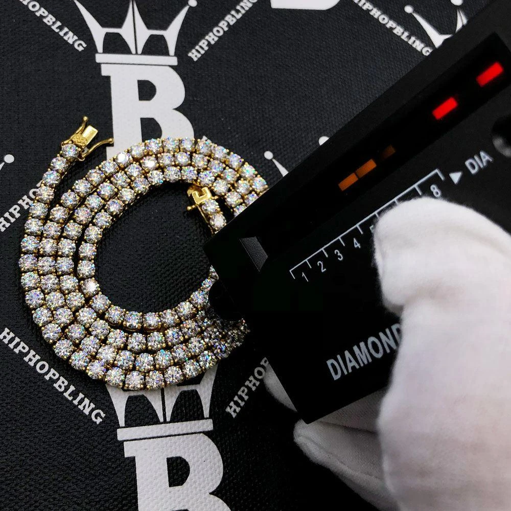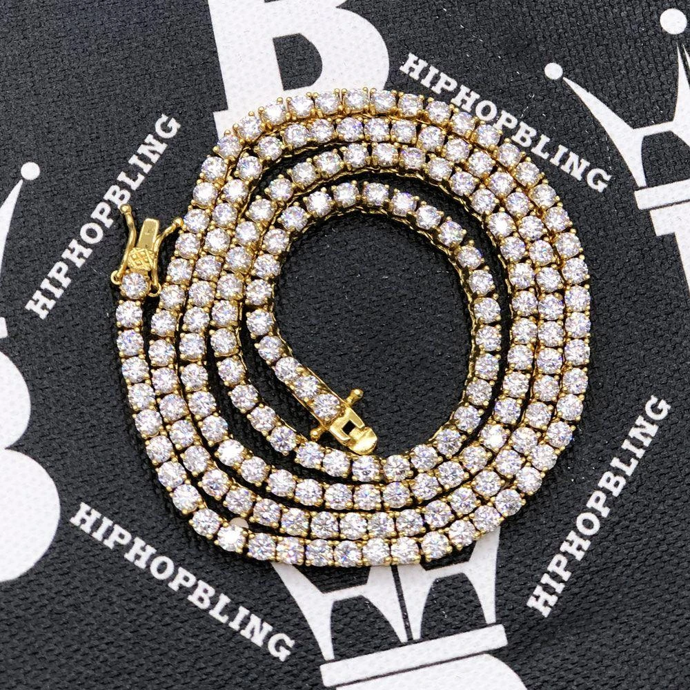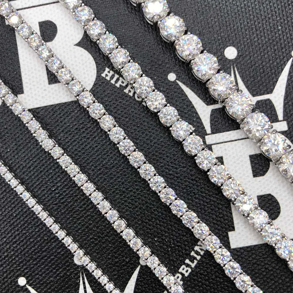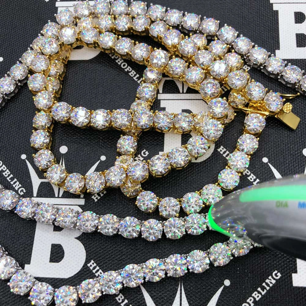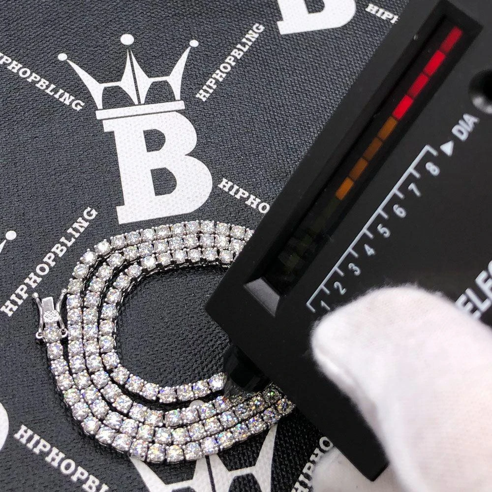 Moissanite VVS D Hand Crafted Tennis Chain Necklace. This iced out Tennis Chain is simply breathtaking and displays an incredible bling bling shine. We insisted on using the finest Moissanite stones available to craft these perfect high end ‘diamond’ Iced Out Tennis Necklaces. Moissanite stones are carbon based stones just like real Diamonds*. The benefit of our Moissanite Tennis Chains are that you get a better shine for much less money. Our Moissanite Stones have a higher refractive index than real Diamonds and rank 9.5 on Mohs hardness scale. Â
