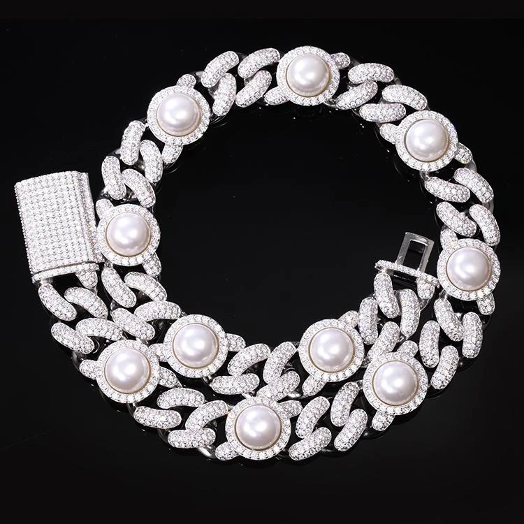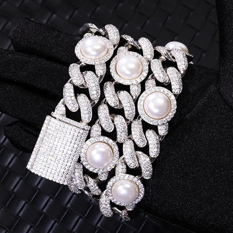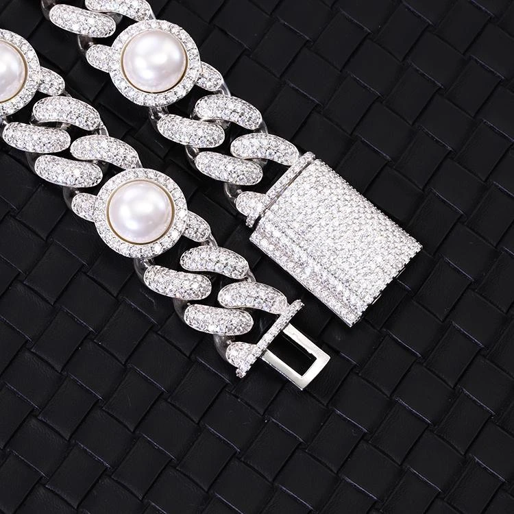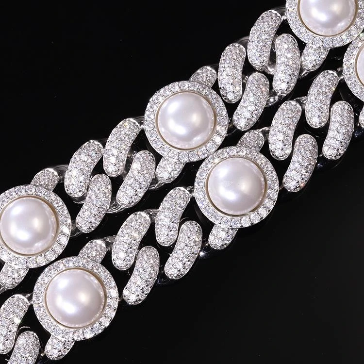 Pearl Link Moissanite Iced Out Cuban Chain .925 Sterling Silver. This iced out Cuban Chain is simply breathtaking and displays an incredible bling bling shine. We insisted on using the finest Moissanite stones available to craft these perfect high end ‘diamond’ Iced Out Cuban Link Necklaces. Moissanite stones are carbon based stones just like real Diamonds*. The benefit of our Moissanite Cuban Link Chains are that you get a better shine for much less money. Our Moissanite Stones have a higher refractive index than real Diamonds and rank 9.5 on Mohs hardness scale. Â