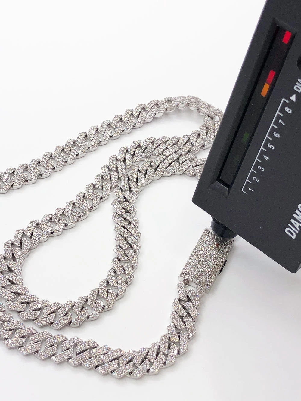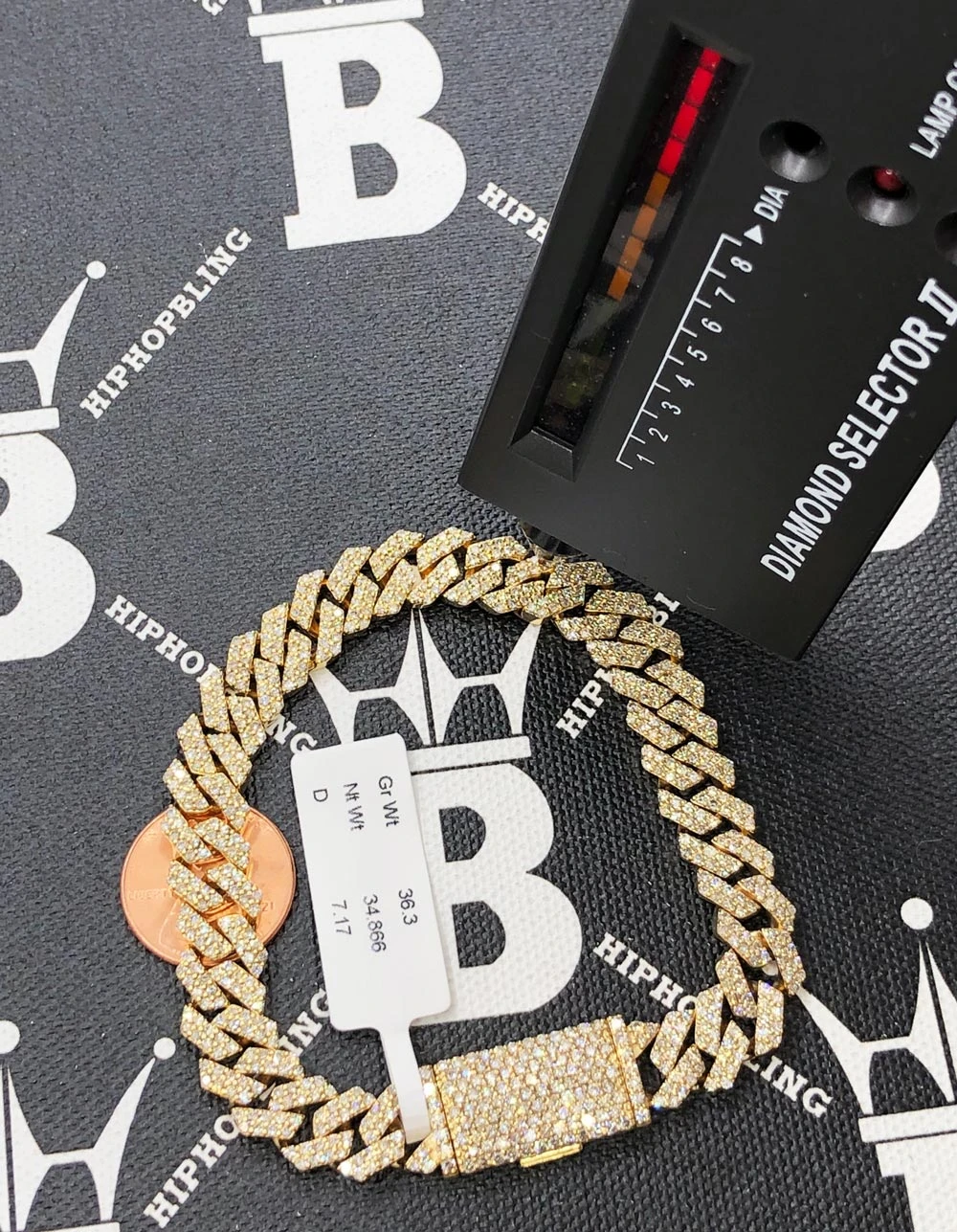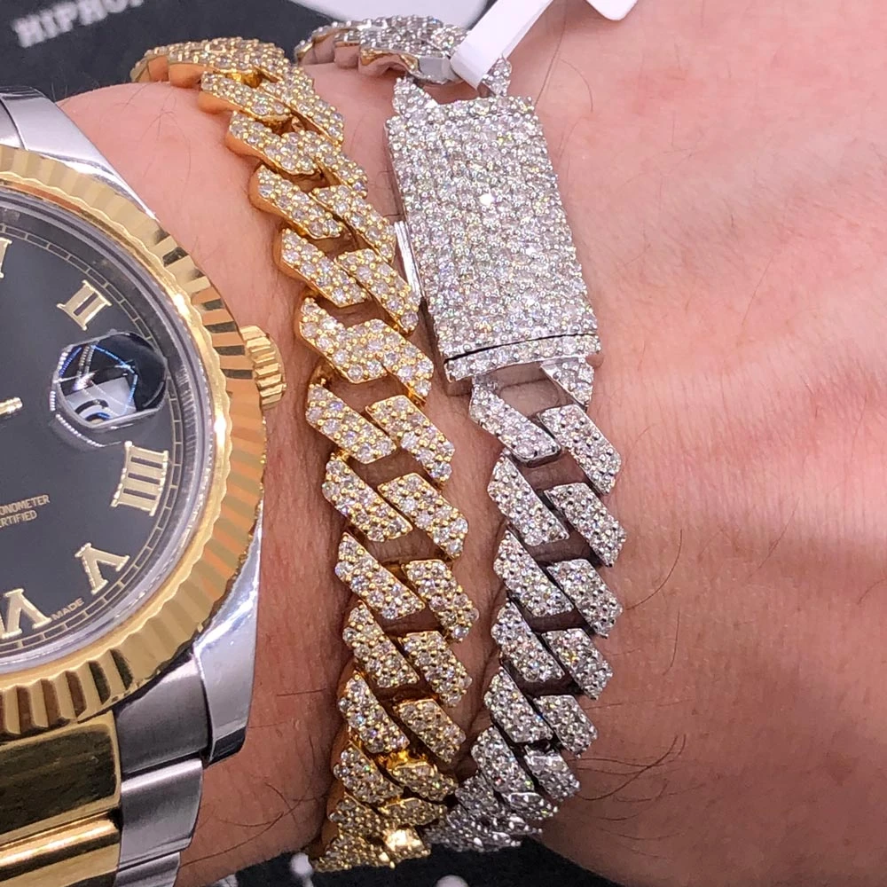 Real Diamond Cuban Chain 10MM Sharp Links 10K Yellow or White Gold. Each link has 2 rows of genuine diamonds per side for extra shine. 10K Gold Diamond Cuban Chain with a secure diamond fold over lock clasp.  Popular quality crafted real Diamond cuban chain iced out with a bling bling shine.  Custom Designer looking Mens Bling Bling chain. Precision detailed prong Diamond Setting on this Diamond iced out chain. Beautiful big and bold look. Popular style Hip Hop Bling Bling necklace or bracelet is crafted with 10K Yellow Gold or 10K White Gold and Genuine Natural Diamonds.