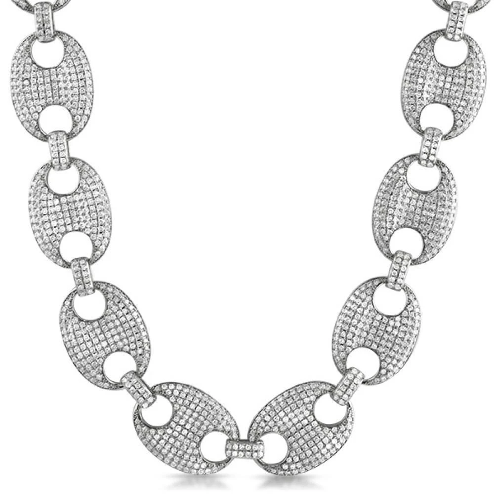 Rhodium Marine Link 24MM Wide CZ Bling Bling Chain. This mega fat Marine Link bling bling chain shines like no other. The massive surface area of stones will light up your neck and blind the haters out there. All prong set simulated stones for the most realistic and authentic look and shine. This is a great hip hop chain if you want to show major bling around your neck. Order today.